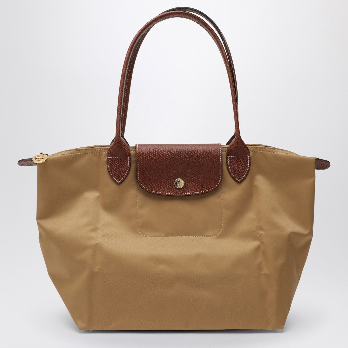 Medium shoulder bag by Longchamp in Fawn-coloured econyl recycled polyamide canvas with brown leather details, featuring two top handle, foldover top with magnetic closure, zipper closure and main compartment.