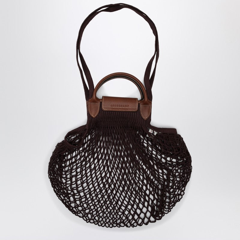 Eggplant-coloured cotton handbag from Longchamp, featuring an openwork mesh design, two top handles, a flap and press stud fastening and leather details.