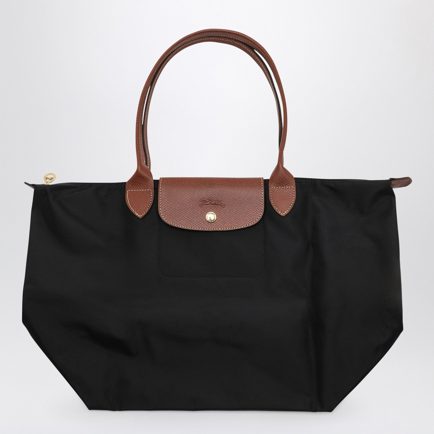 Large shoulder bag by Longchamp in black econyl recycled polyamide canvas with brown leather details, featuring two top handle, foldover top with magnetic closure, zipper closure and main compartment.