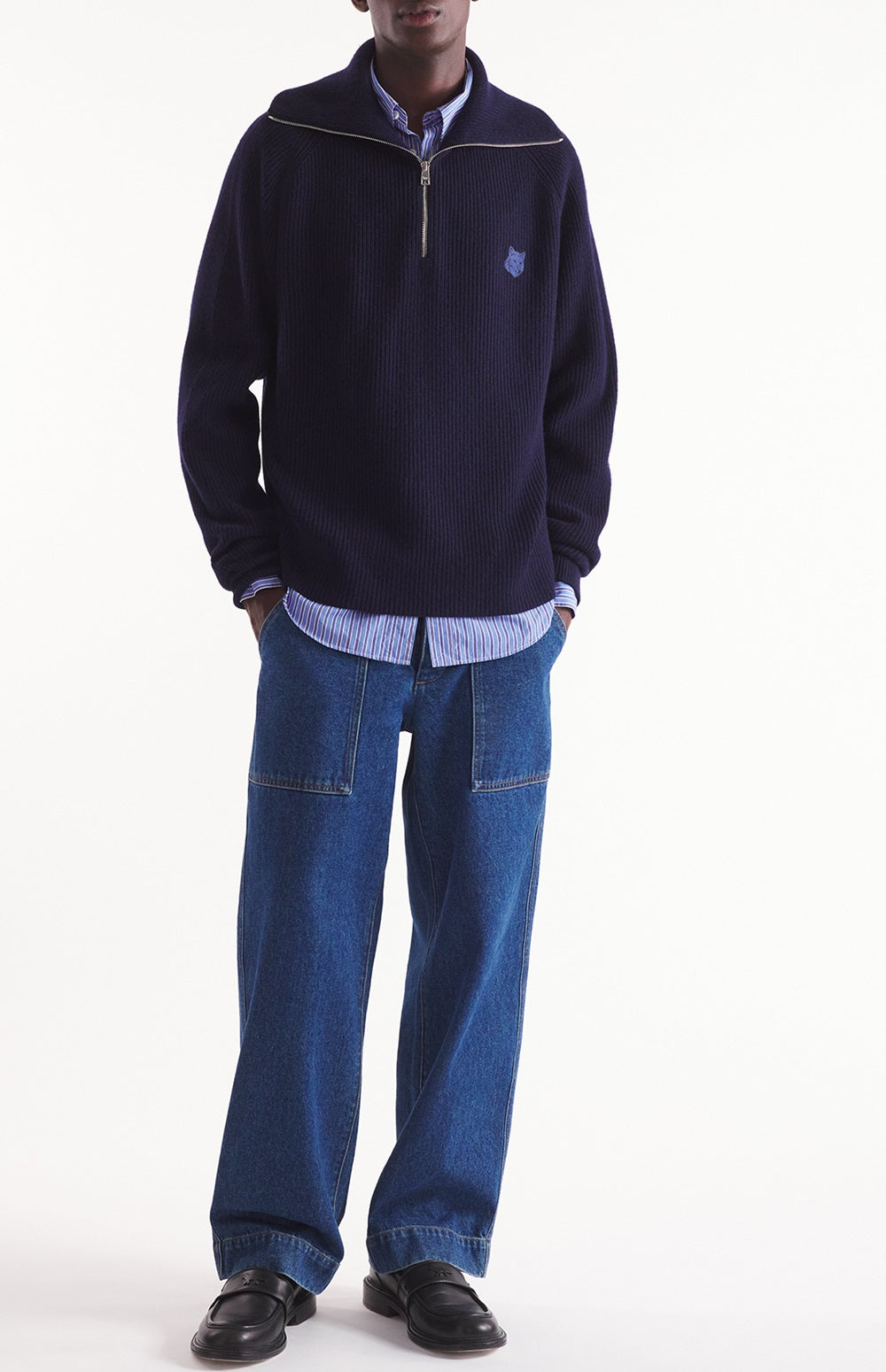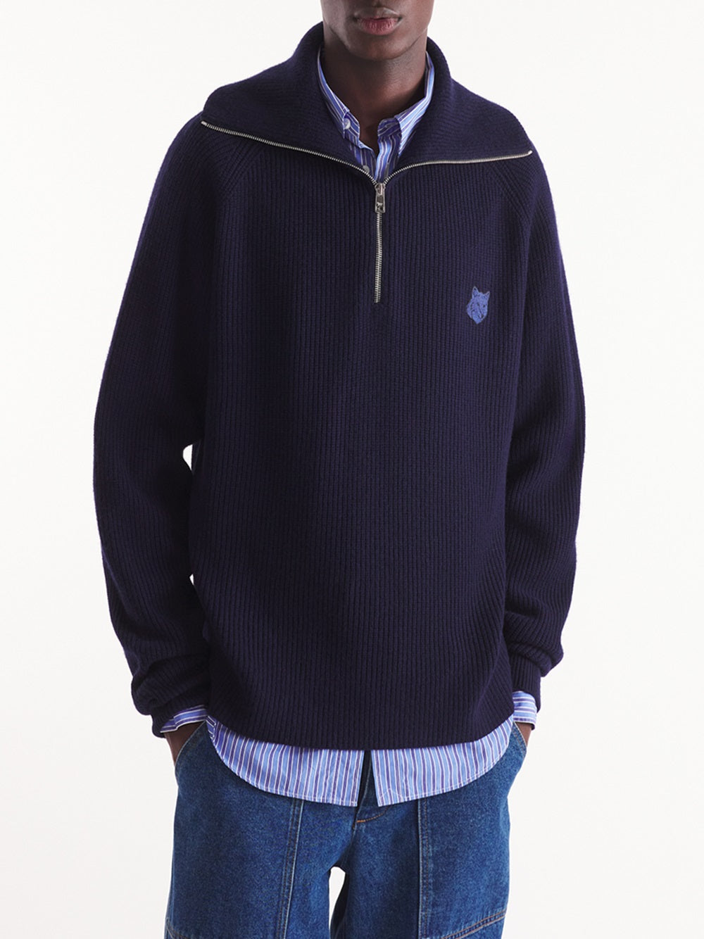 Long-sleeved merino wool blend sweater with zip. Regular fit with Bold Fox Head patch embroidered on the chest.