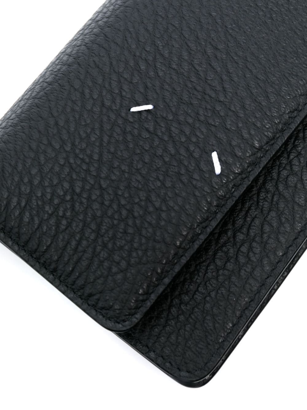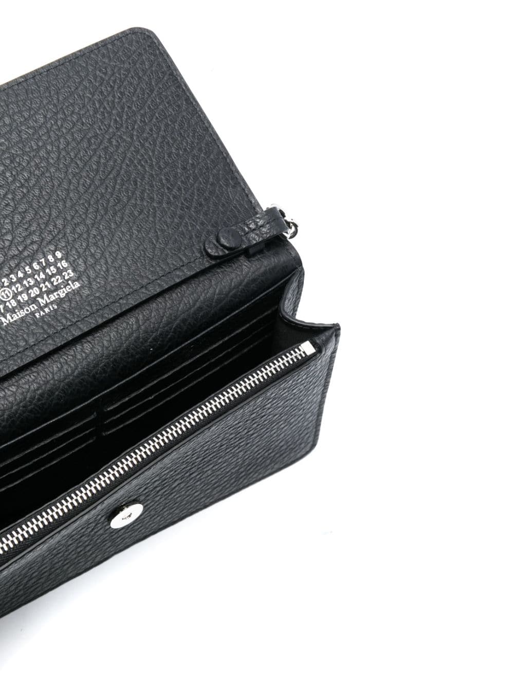Black, calfskin, textured texture, decorative stitching, top flap with snap button, internal bellows pockets, internal zip pocket, removable shoulder strap with chain and single compartment.