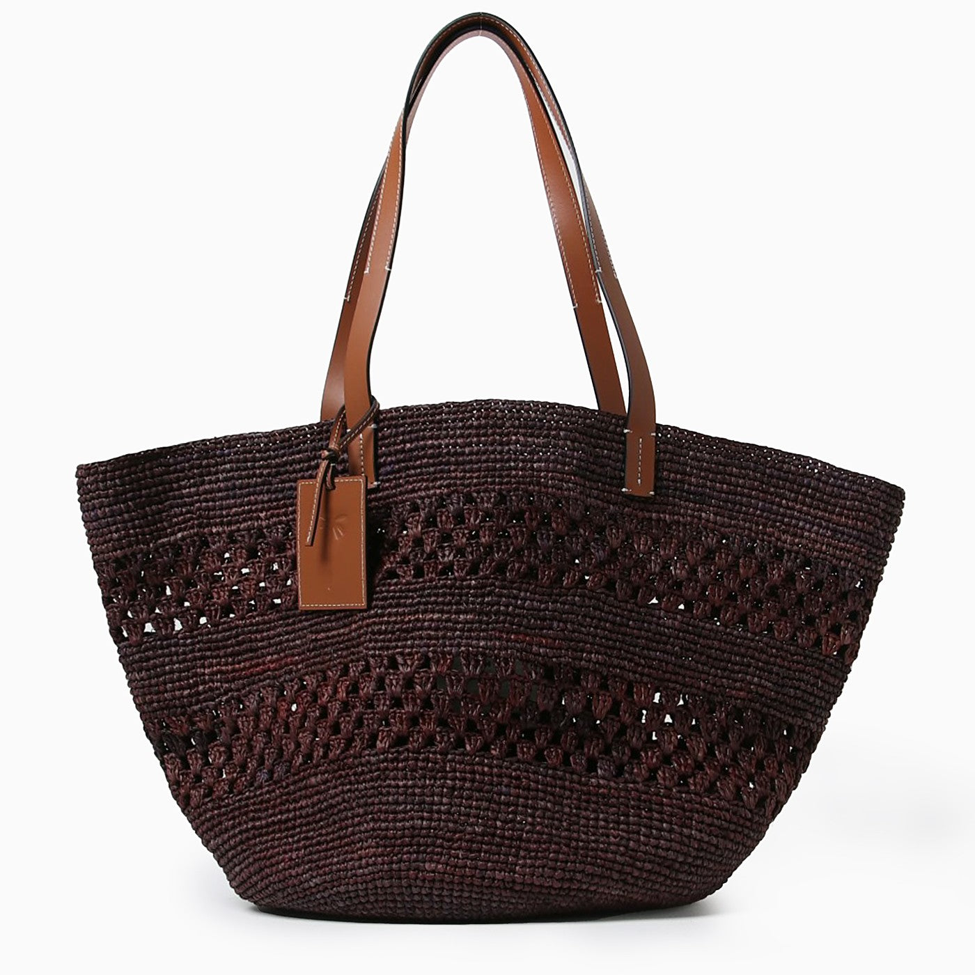 Chocolate-coloured raffia bag by Manebí, featuring two leather top handles, an internal flat pocket and a removable leather logo tag.