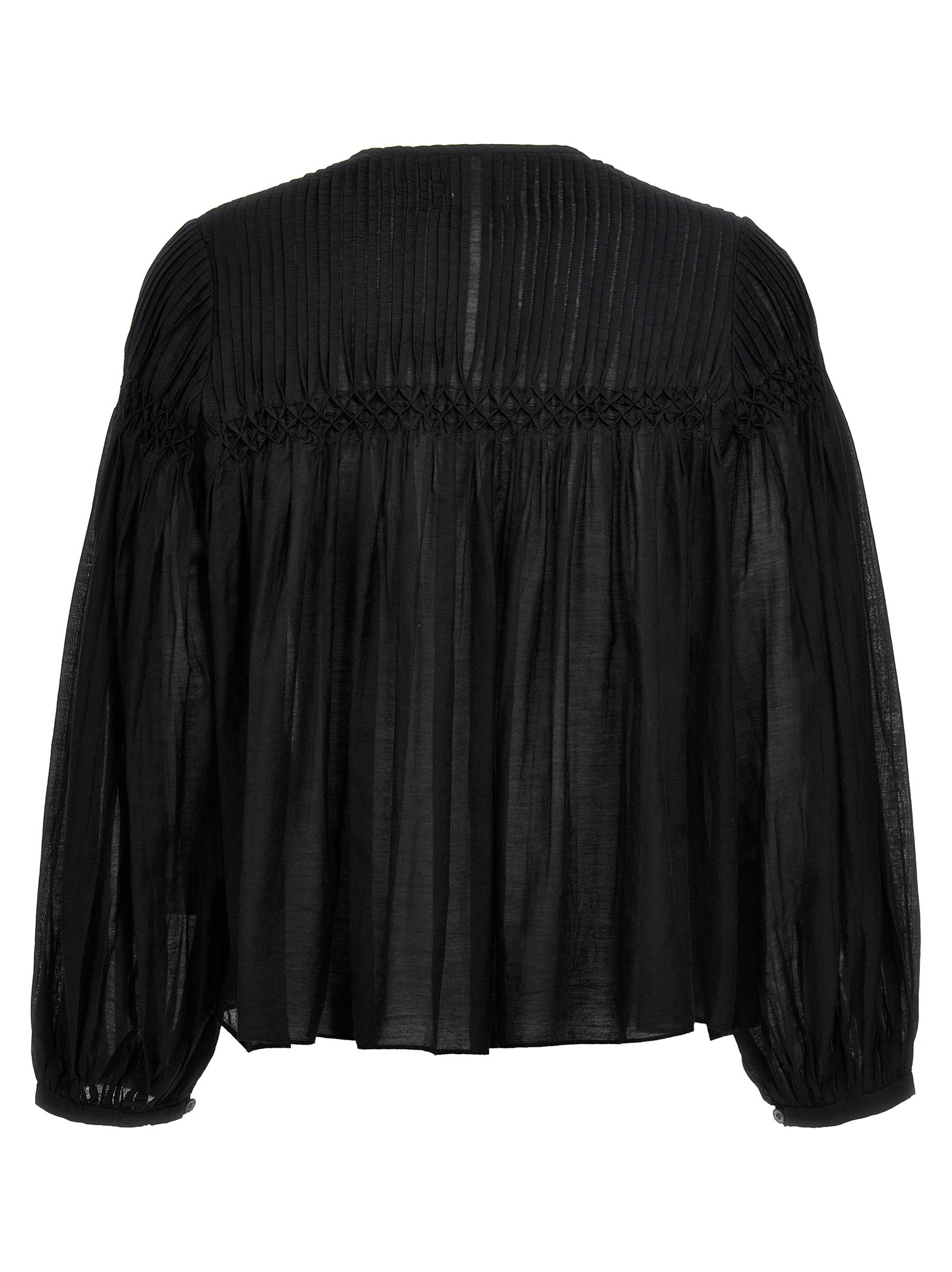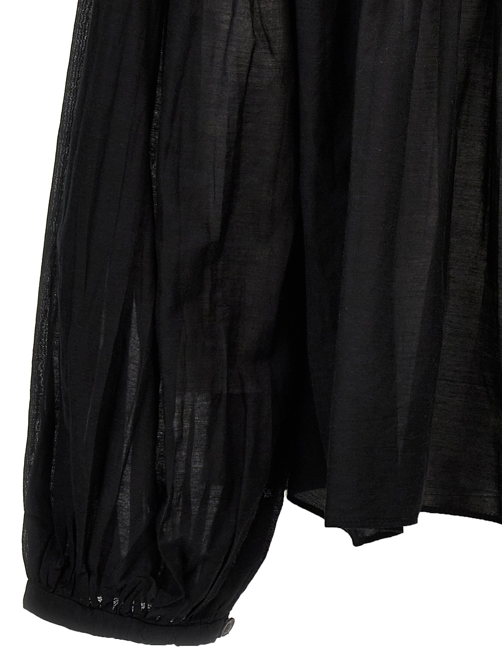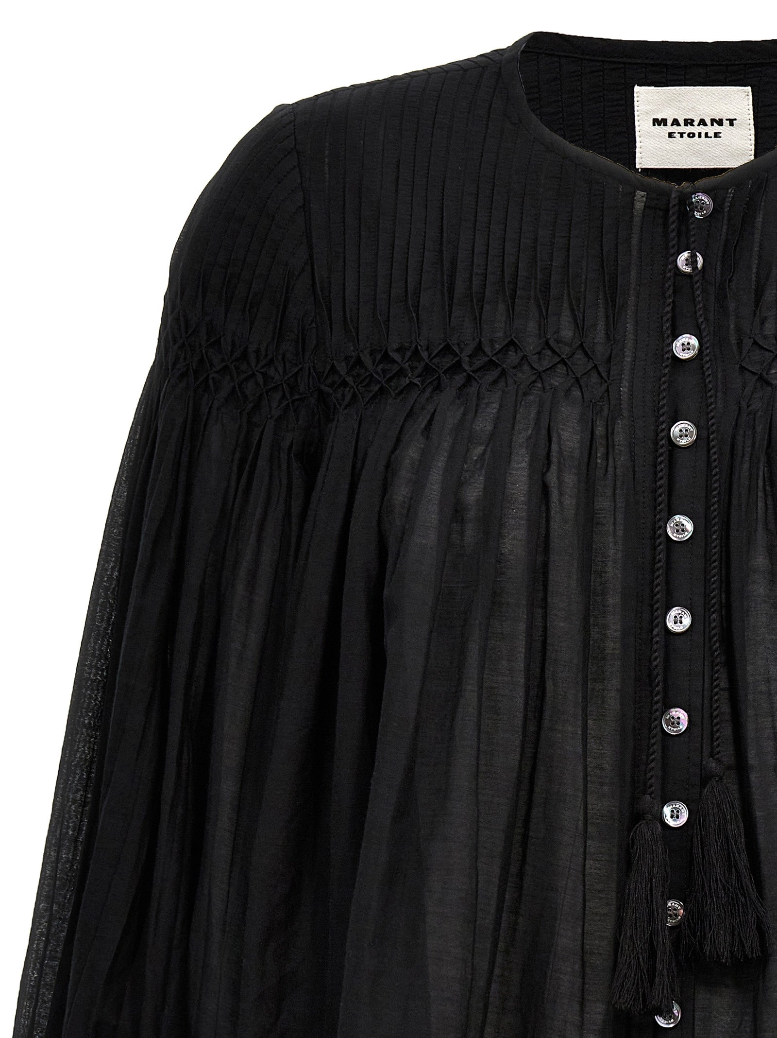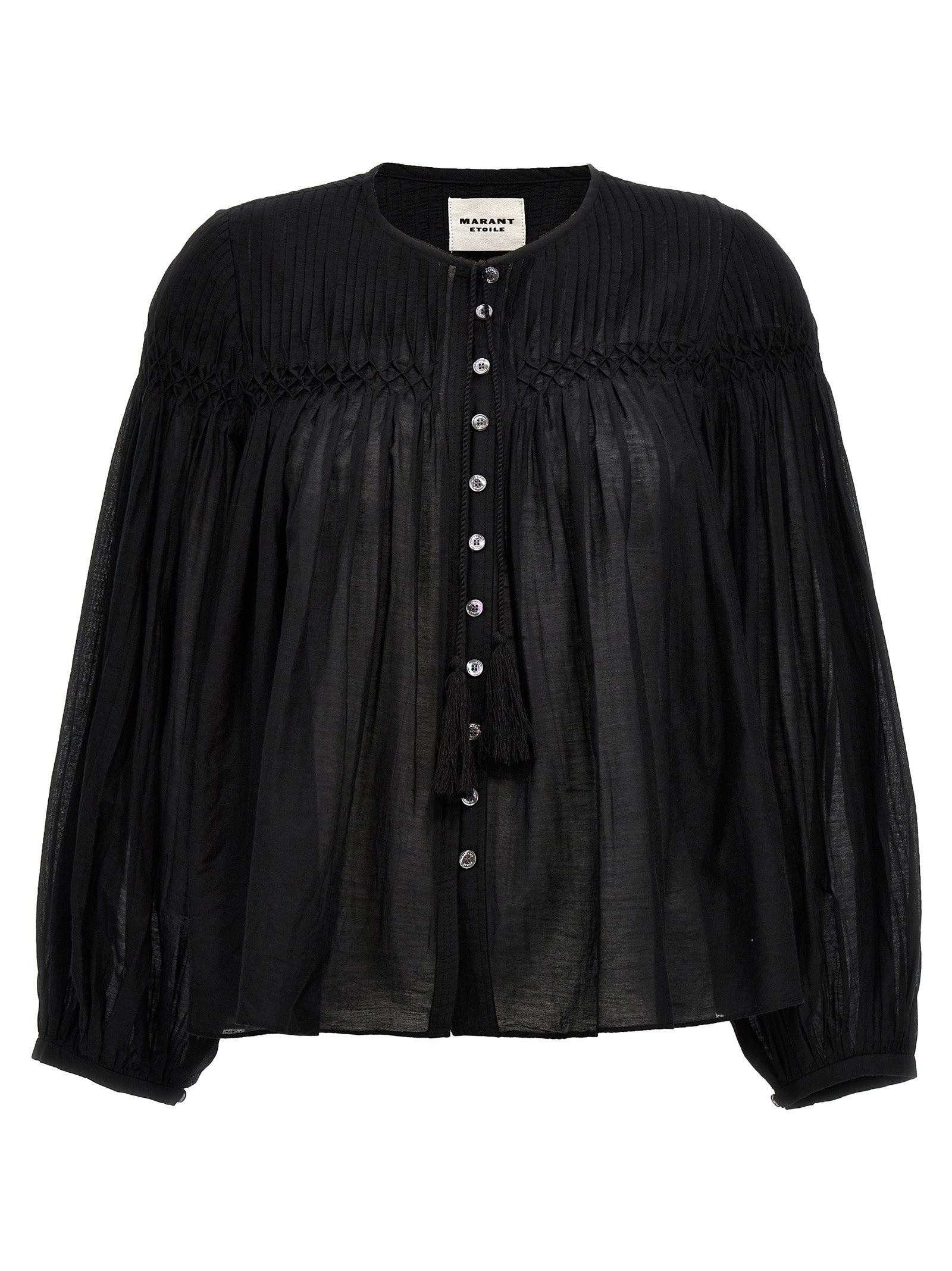 'Abadi' cotton blend shirt with front button closure and tassel drawstring at the neck, long sleeves, pleated detail at the top.
