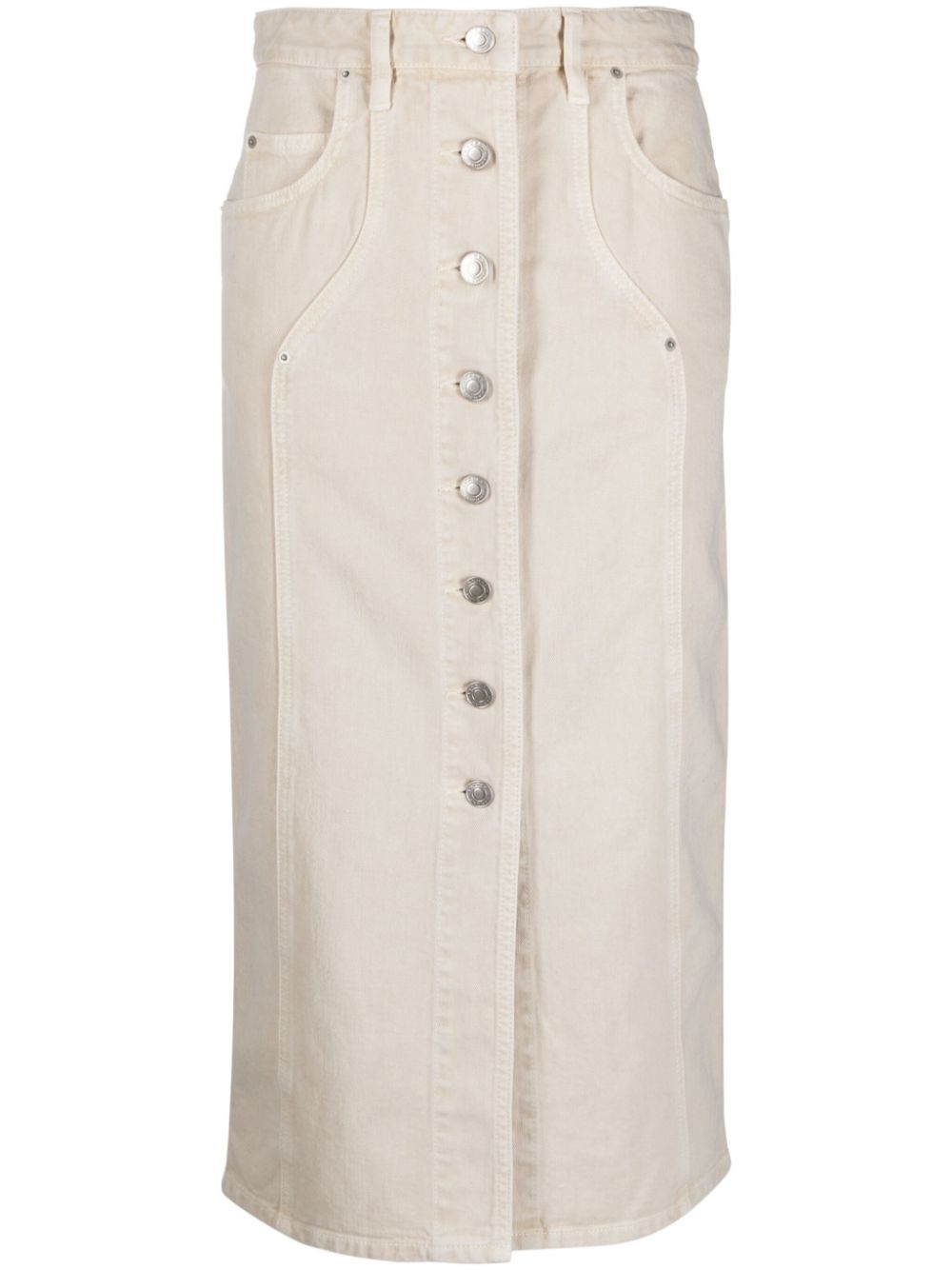 ecru organic cotton blend denim logo patch to the rear front button fastening logo-embossed buttons belt loops stud detailing column silhouette classic five pockets front slit straight hem calf-length This item is made from at least 50% organic materials. Learn more about what makes a product Conscious on our Conscious Criteria page