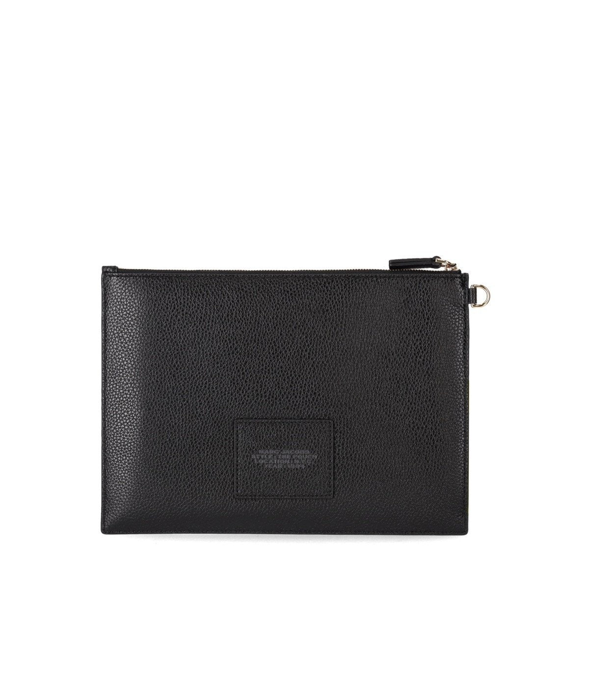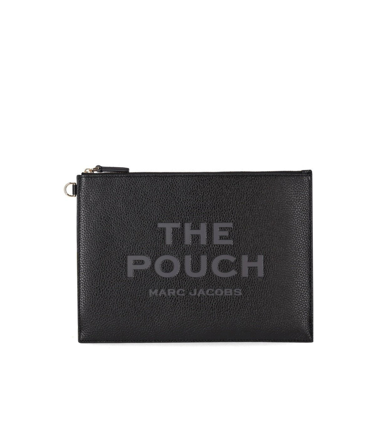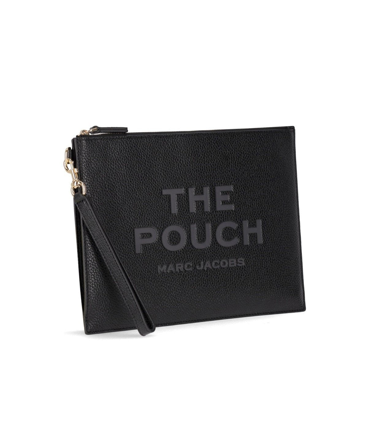 The Leather Pouch bag by Marc Jacobs made of black pebbled leather. Front logo, lined interior, equipped with card slots, zip closure, and detachable wrist strap. Measurements 28x20.5x1.5 cm.