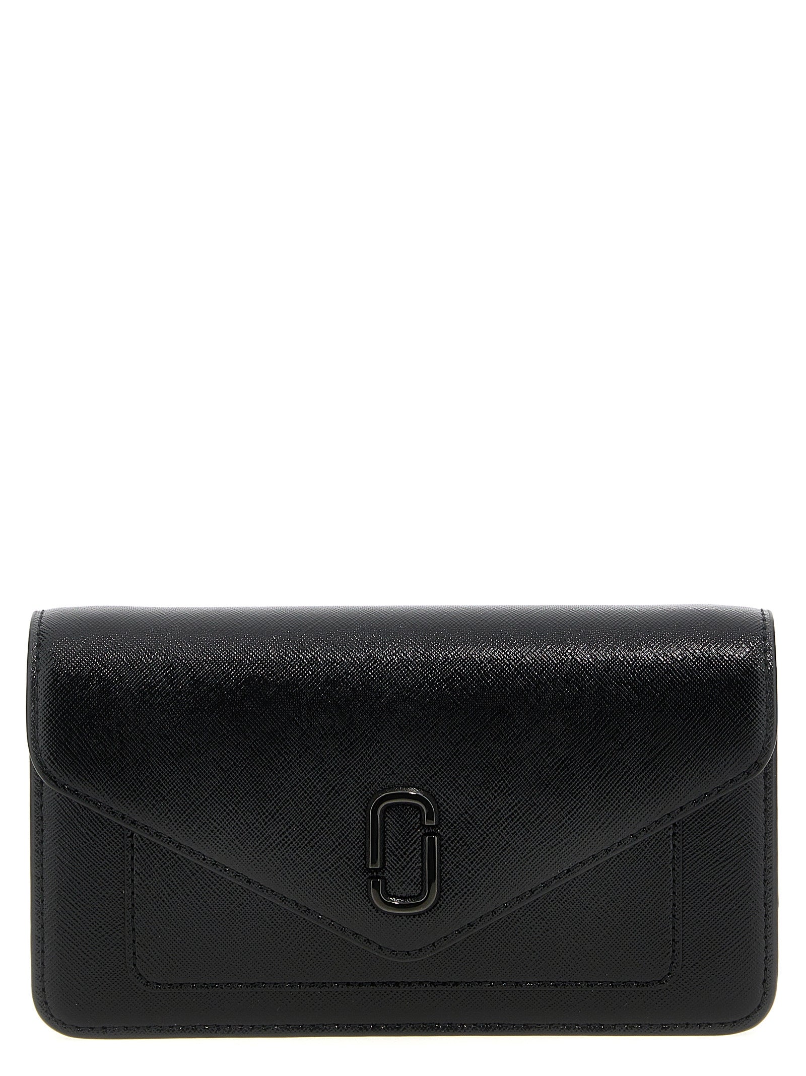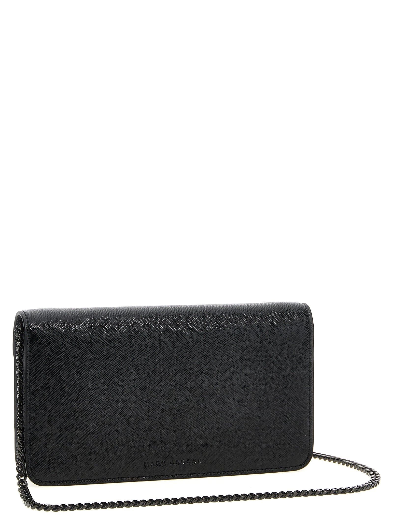'The Longshot' wallet on chain in Saffiano leather, magnetic flap closure with front metal logo, removable chain shoulder strap.