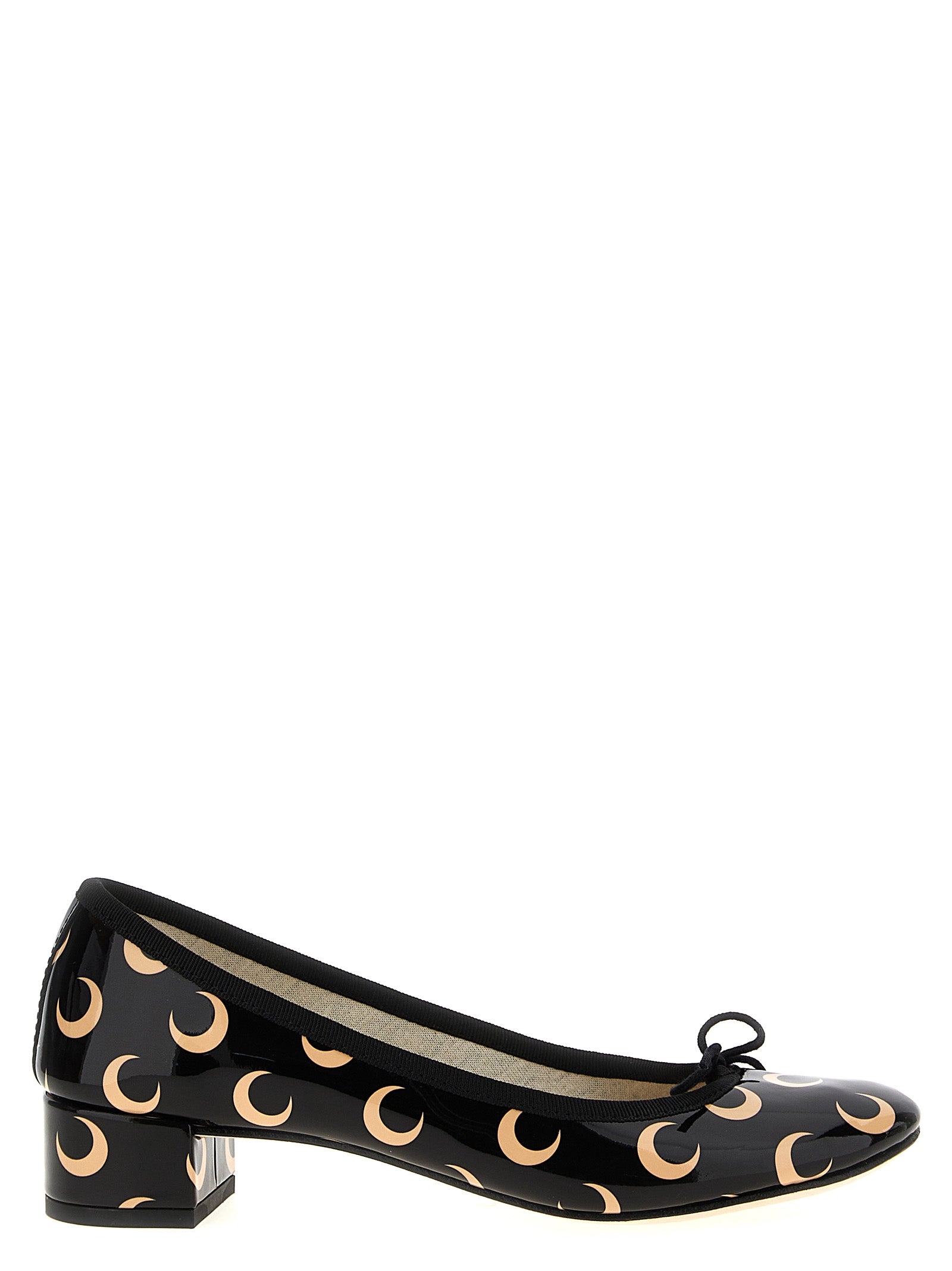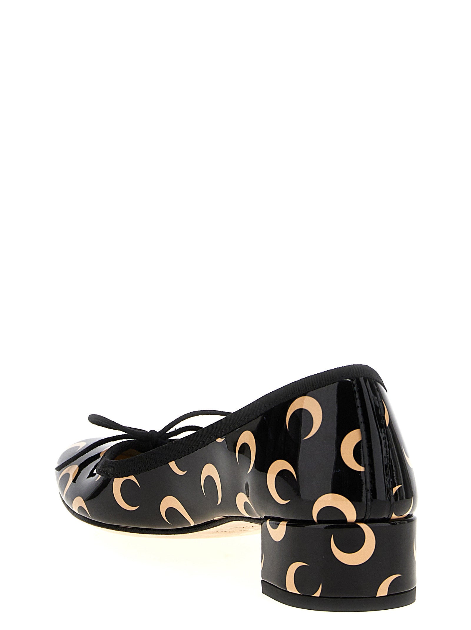 Marine Serre x Repetto 'Camille' patent leather ballet flats with all-over Moon print, front bow, heel, leather sole.