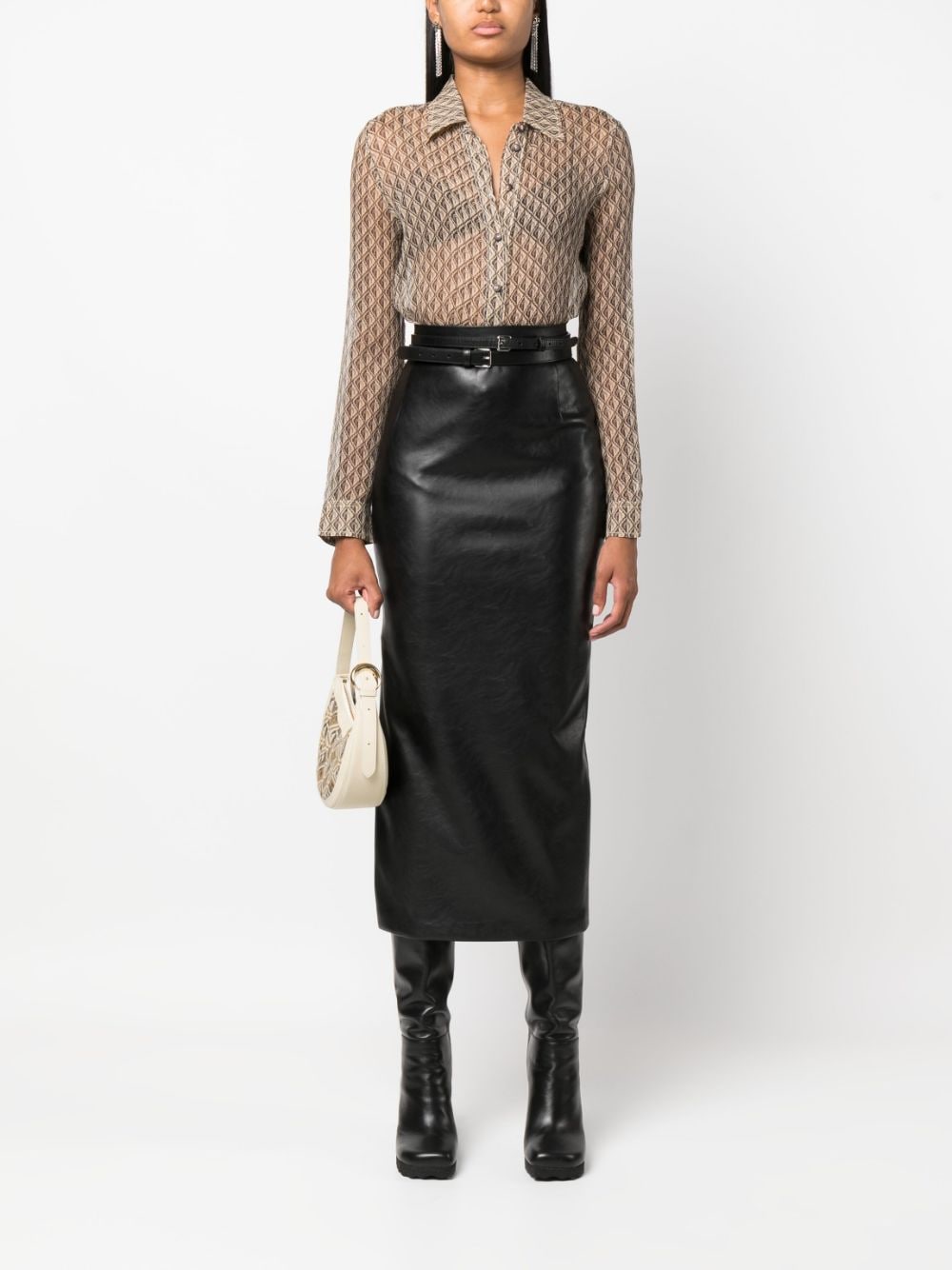 Moon Diamond silk shirt from MARINE SERRE featuring light brown, silk, semi-sheer construction, all-over graphic print, pointed flat collar, front button fastening, long sleeves, buttoned cuffs and curved hem.