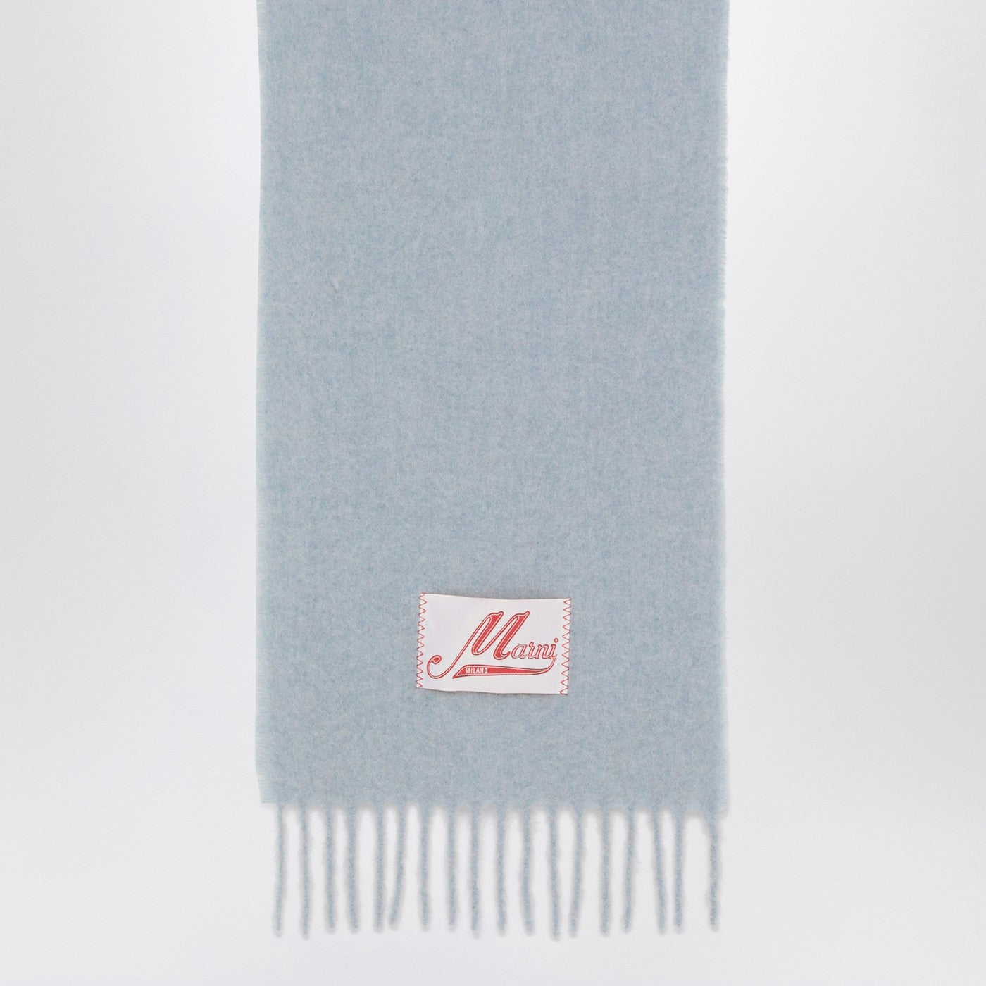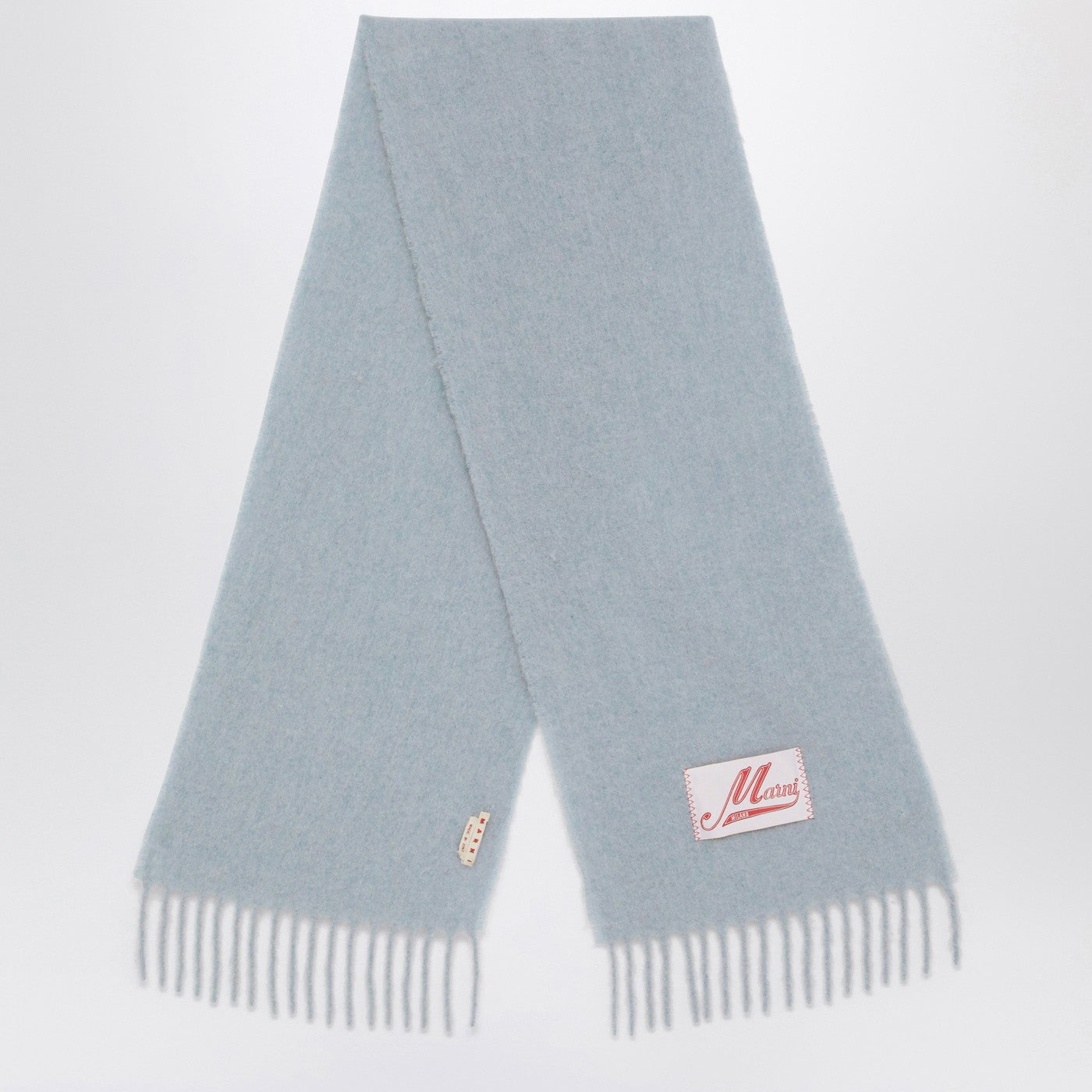 Light blue alpaca scarf by Marni, featuring decorative fringes and logo patch.