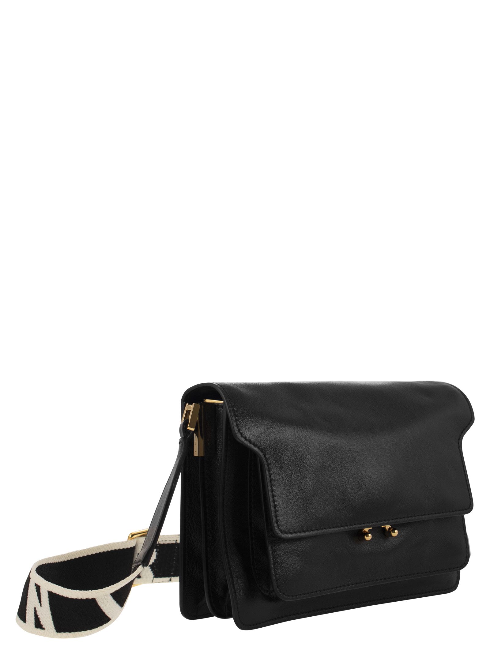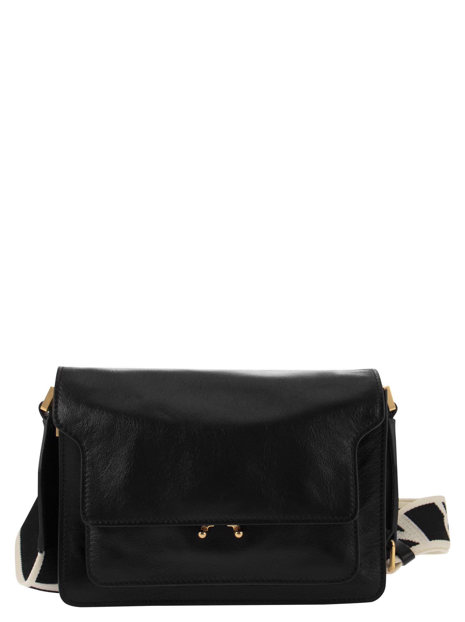 Trunk Soft medium shoulder bag in tumbled leather. One zipped pocket and two internal compartments. Front pocket under flap, rear slit compartment. Finished with an adjustable fabric shoulder strap with contrasting colour Marni lettering. Push-lock closure. Gold-coloured metal elements. - Made in Italy - Fabric lining DESIGNER ID: SBMP0103Q5 P2644 00N99
