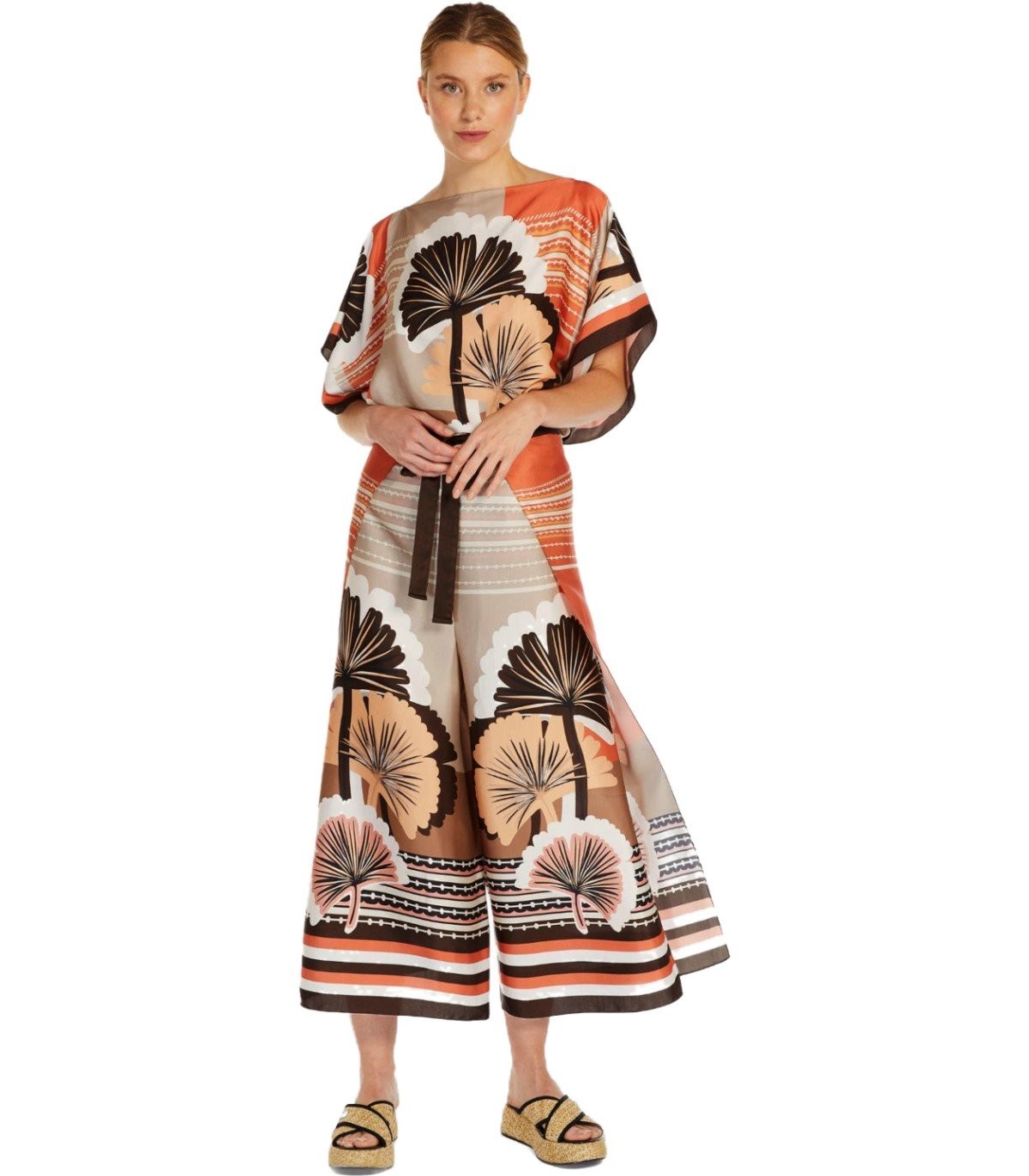 Blasone trousers paleo by Max Mara made of viscose satin with a pattern in shades of orange and beige. High waist, wide leg with slits on the sides and closure with tie ribbons. One size, relaxed fit. Composition: 100% viscose.