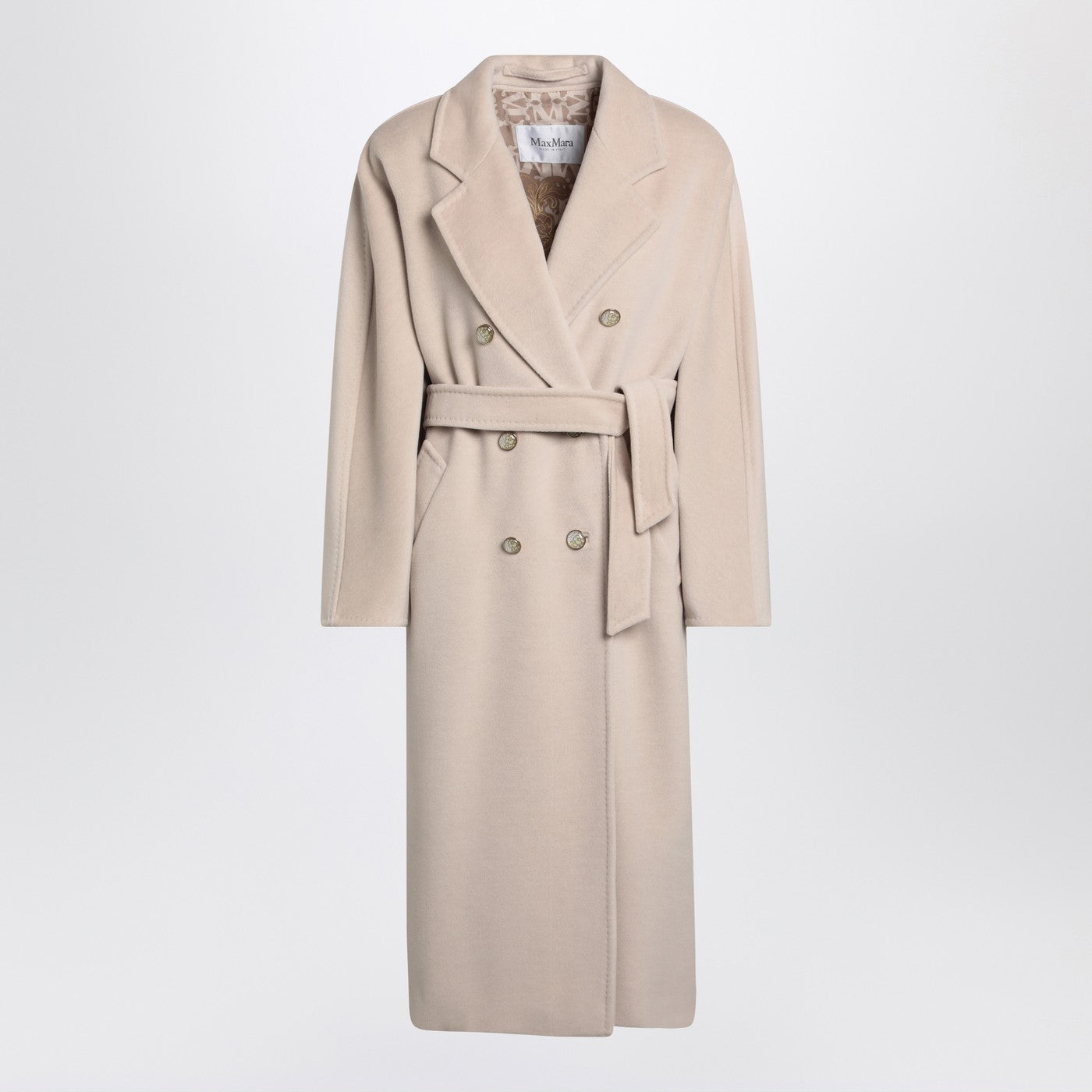 Double-breasted coat by Max Mara in light beige wool and cashmere, featuring a waist belt, long foldable kimono sleeves, wide classic lapels, two side welt pockets, front closure with jewel buttons, and an oversized fit.