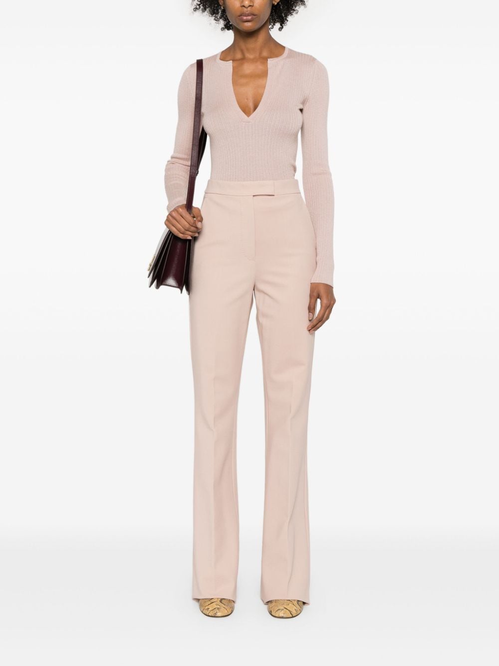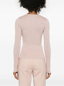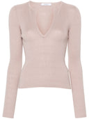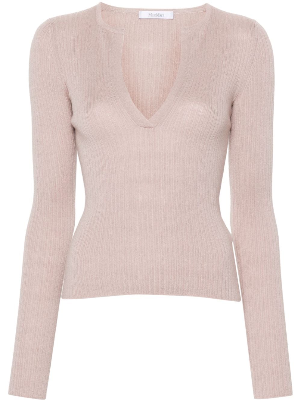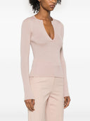 powder pink cashmere-silk blend knitted construction ribbed knit V-neck long sleeves straight hem