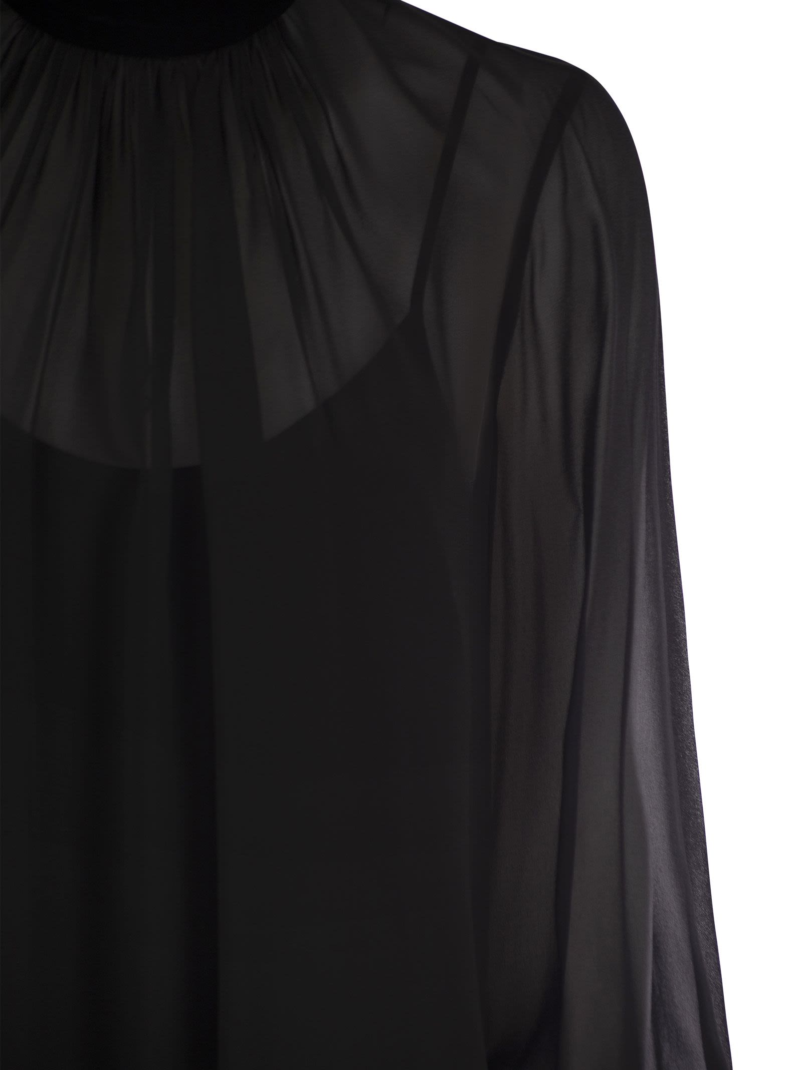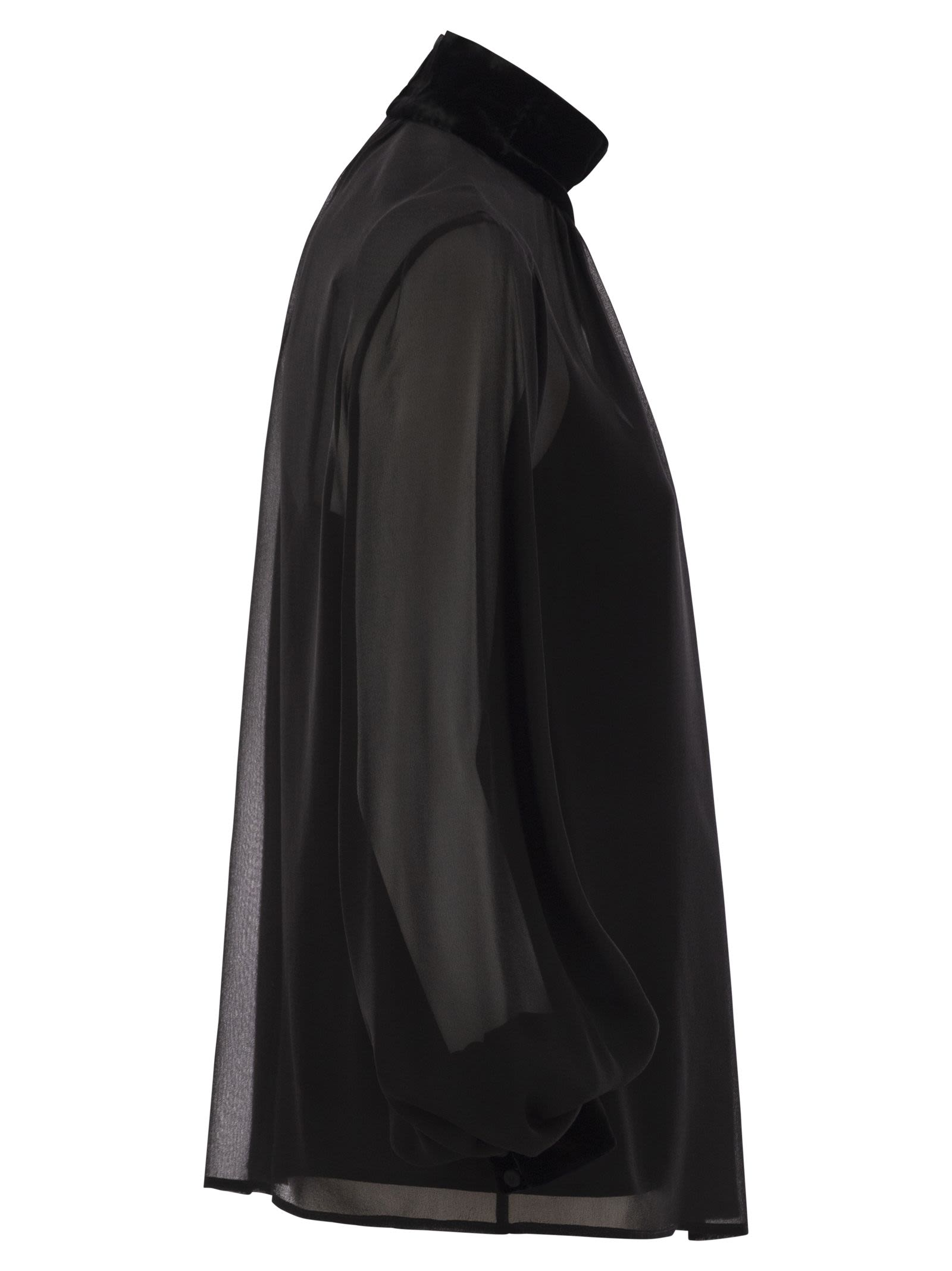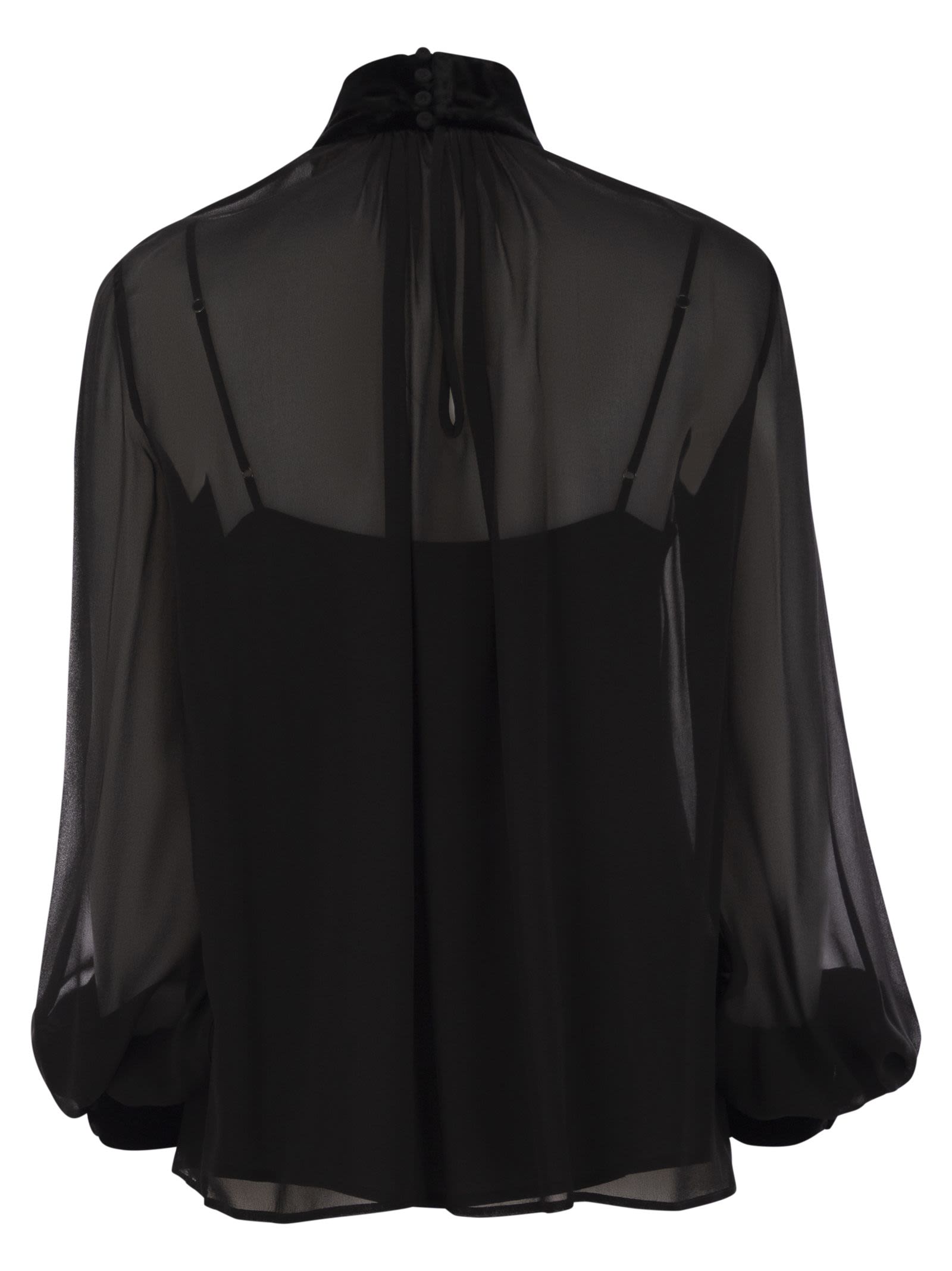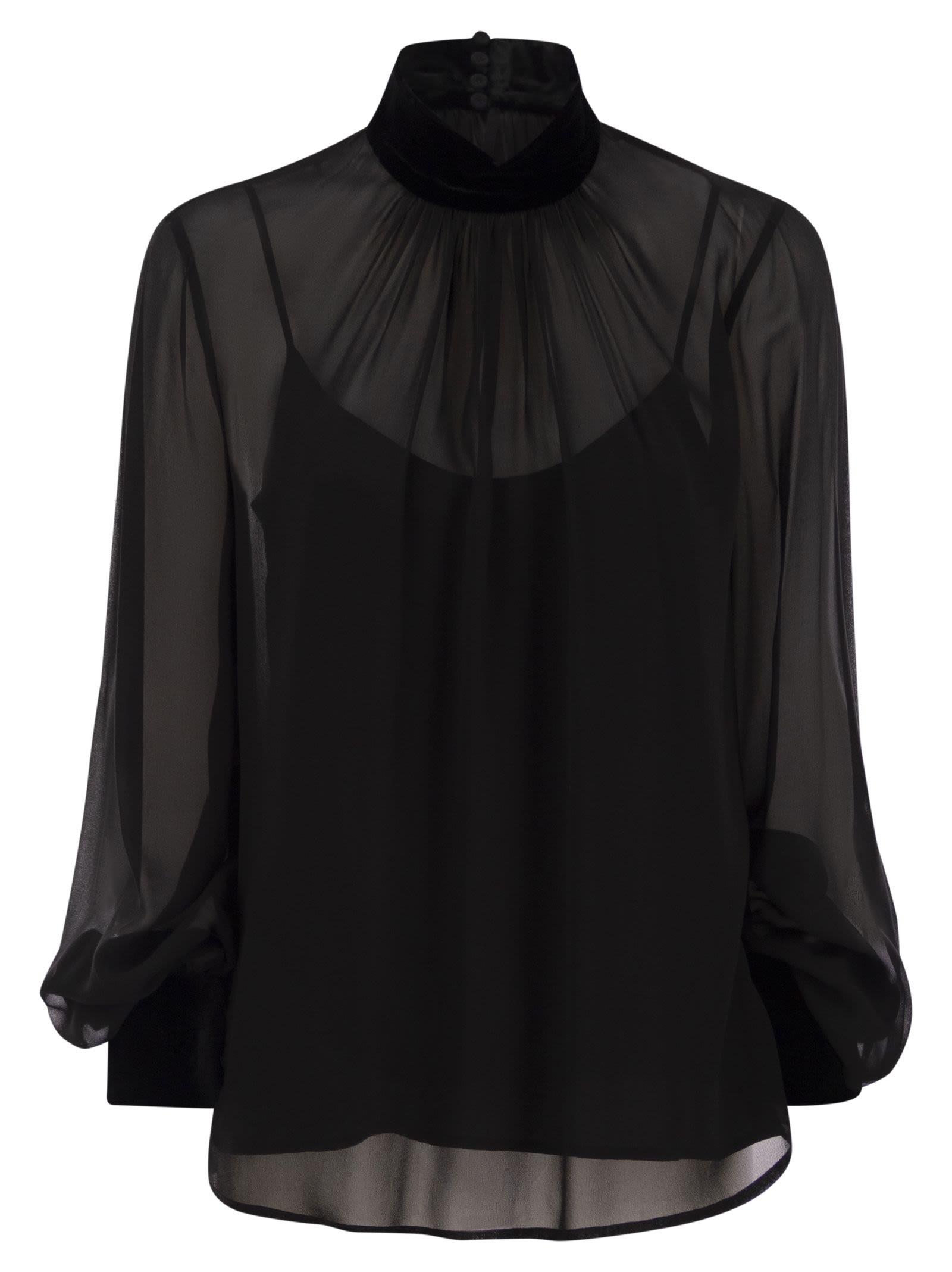 Turtleneck blouse made of precious and light pure silk georgette. Victorian-style model, characterised by a flowing silhouette with a ruffled motif on the neckline, long puff sleeves and matching matching petticoat top. Finished with velvet collar and cuffs with small matching buttons. Drop fastening with small buttons covered in matching georgette on the back of the neck. - Victorian style - Petticoat top - High collar - Back closure DESIGNER ID: 2426266014600 007