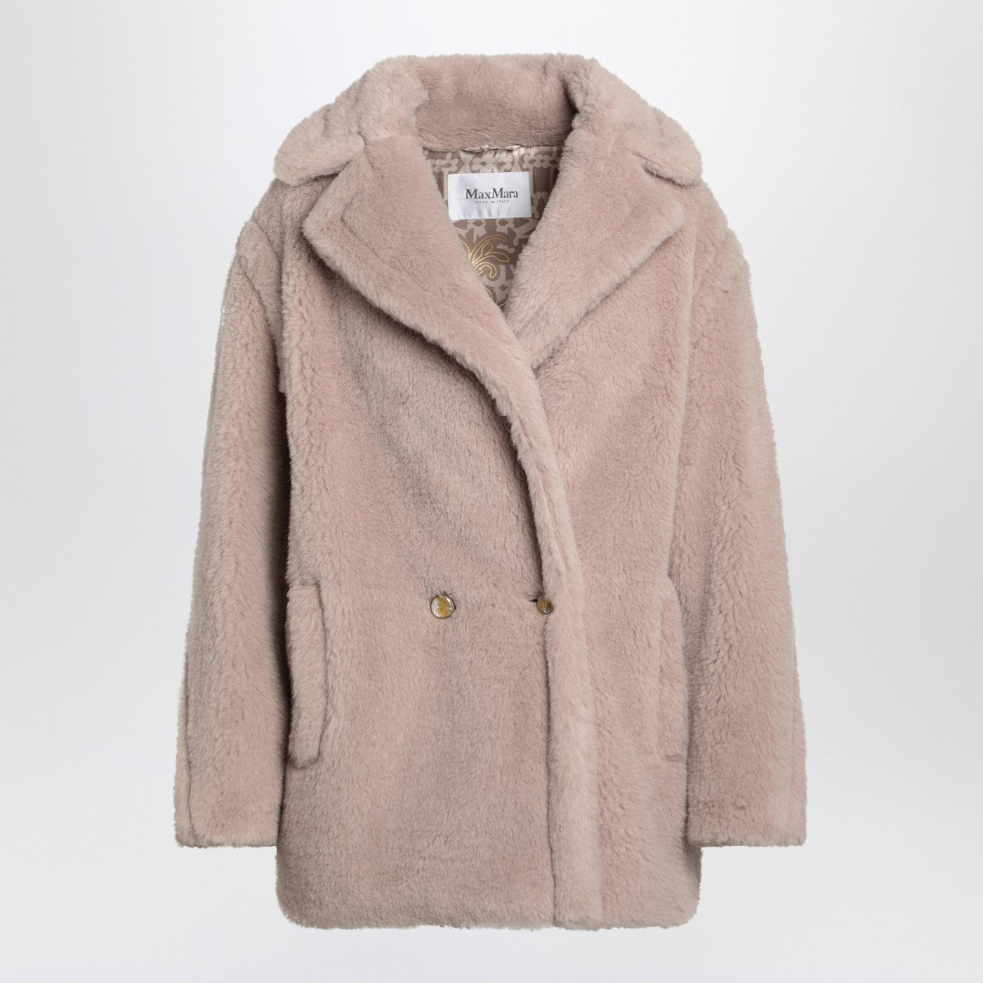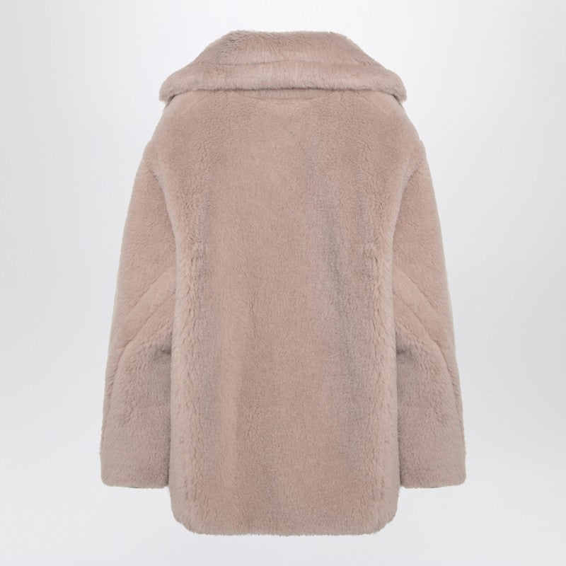 Sand coloured Teddy short coat by Max Mara made of alpaca and wool on silk base, featuring a double-breasted front placket, wide lapels, long sleeves and two side welt pockets.