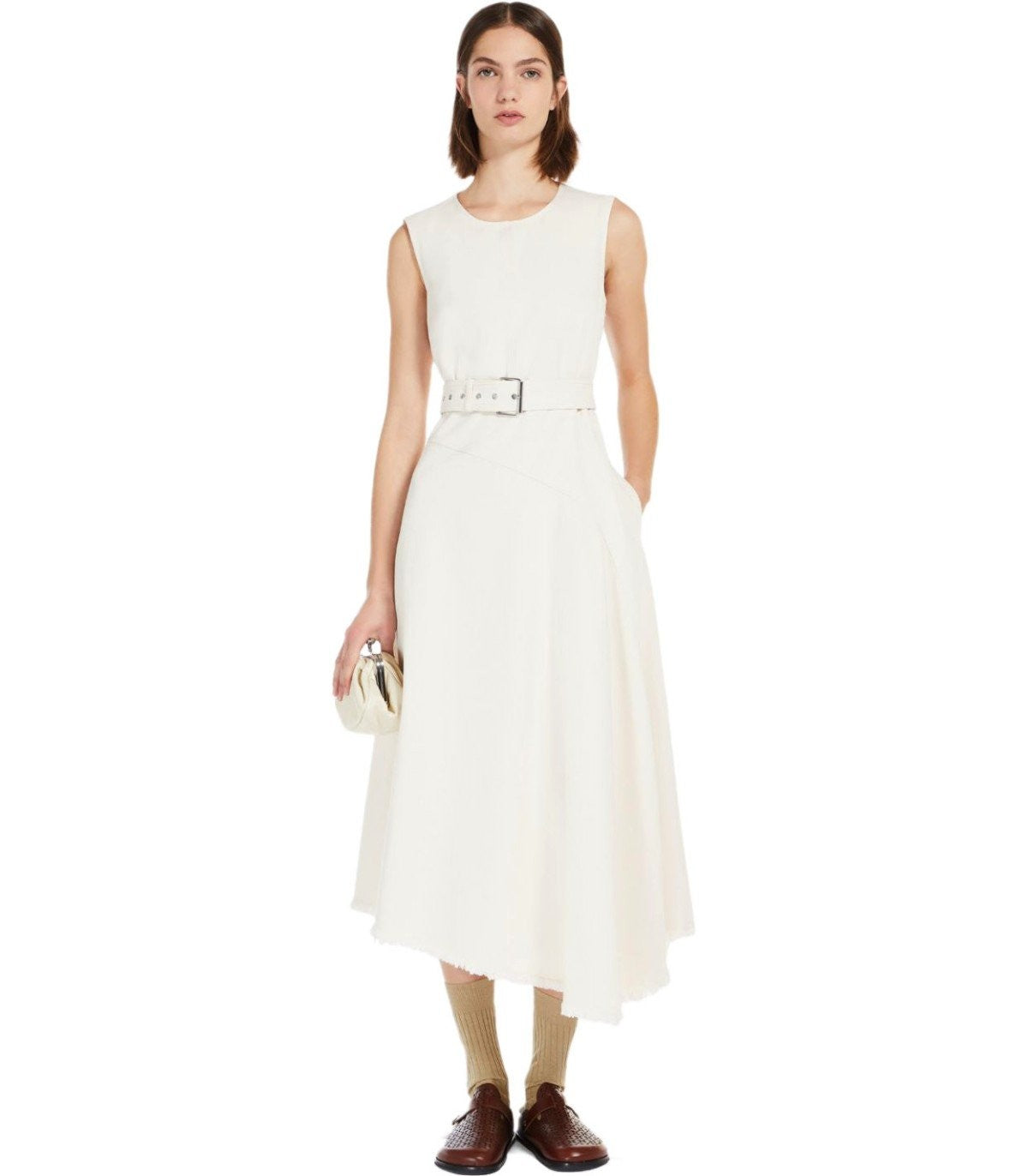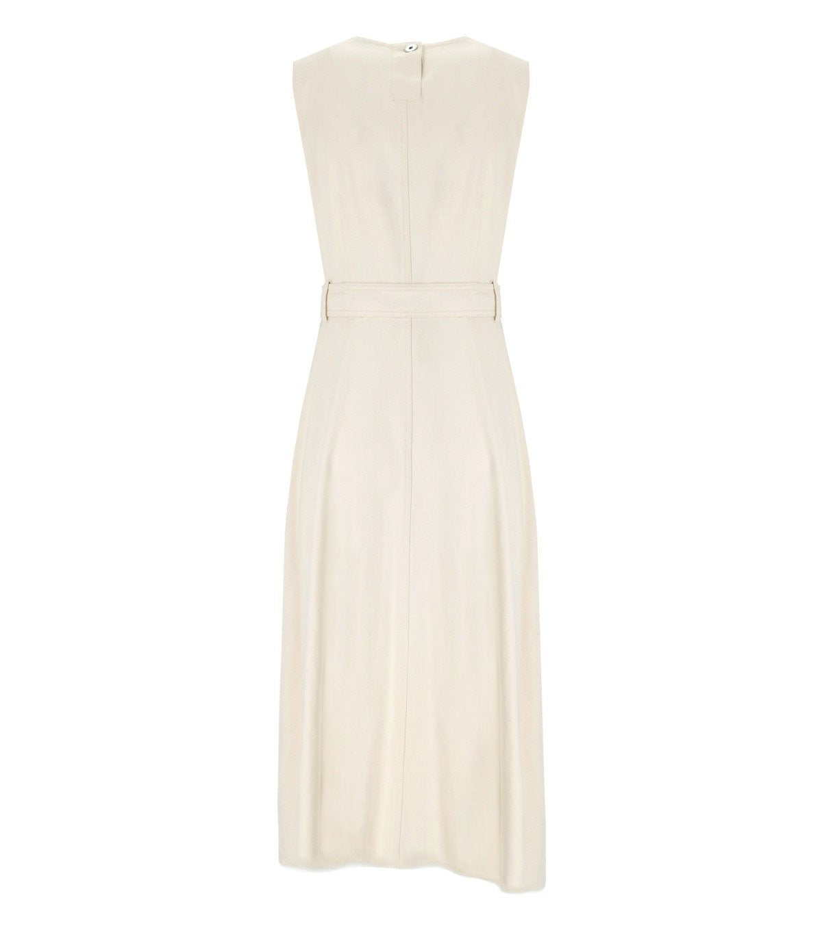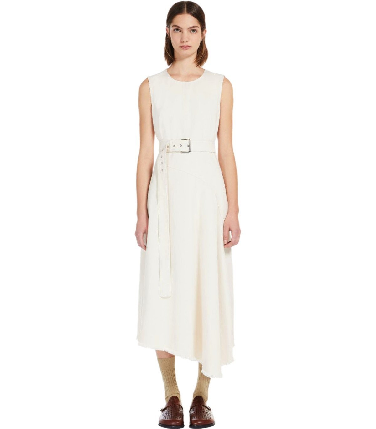 Max Mara Weekend Durata dress made of ecru cotton bull. Button closure at the back and zip on the side, matching belt at the waist and frayed asymmetrical hem. Loose fit. The model is 178 cm tall and wears size 40IT. Composition: 100% cotton.