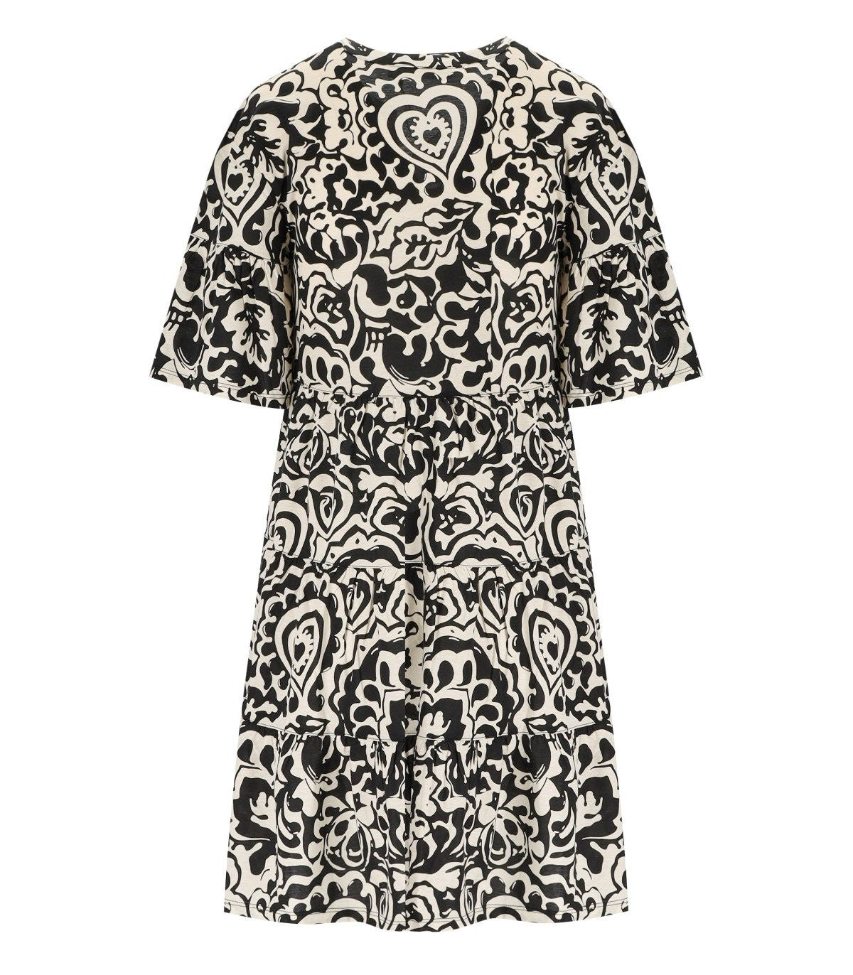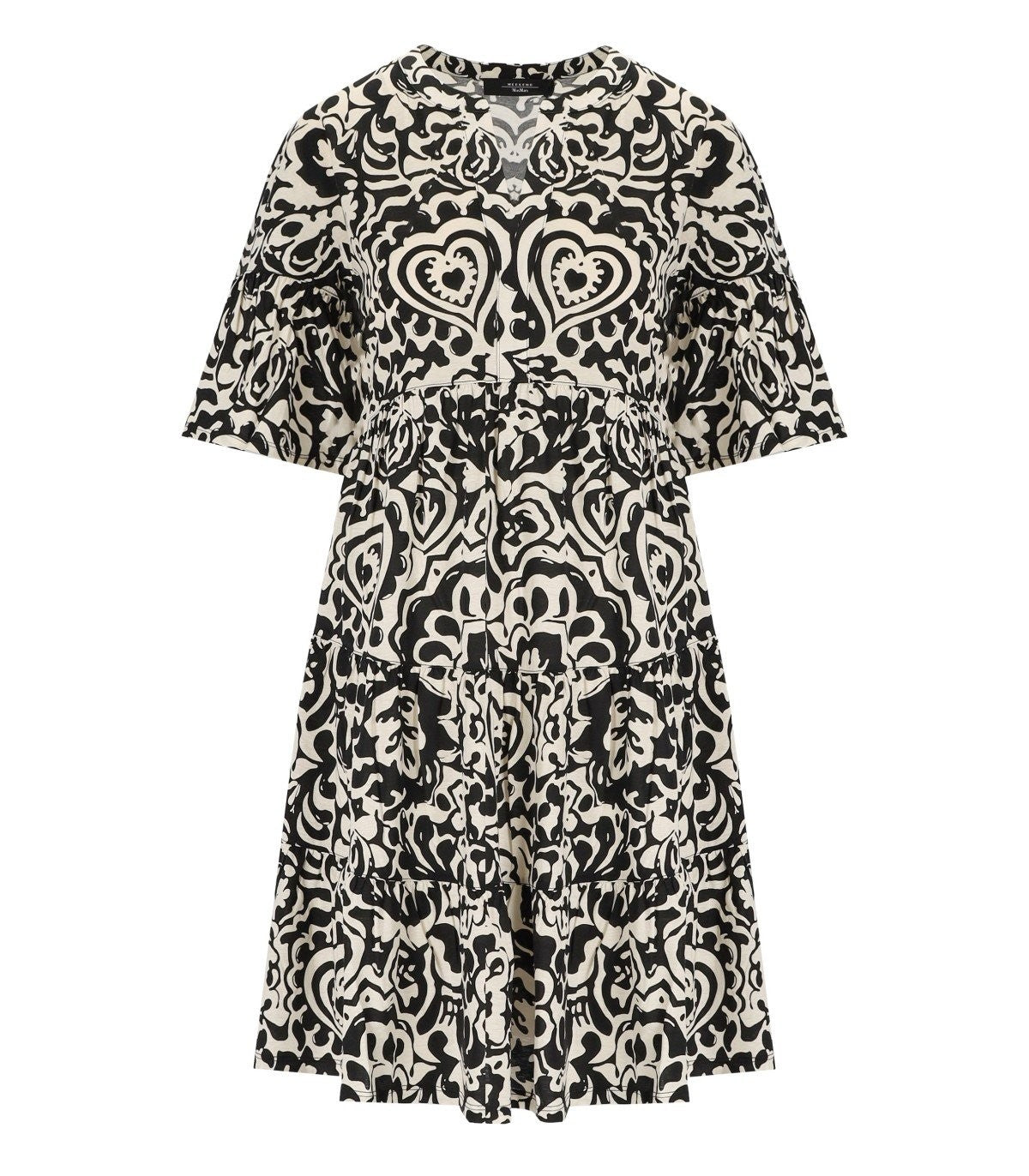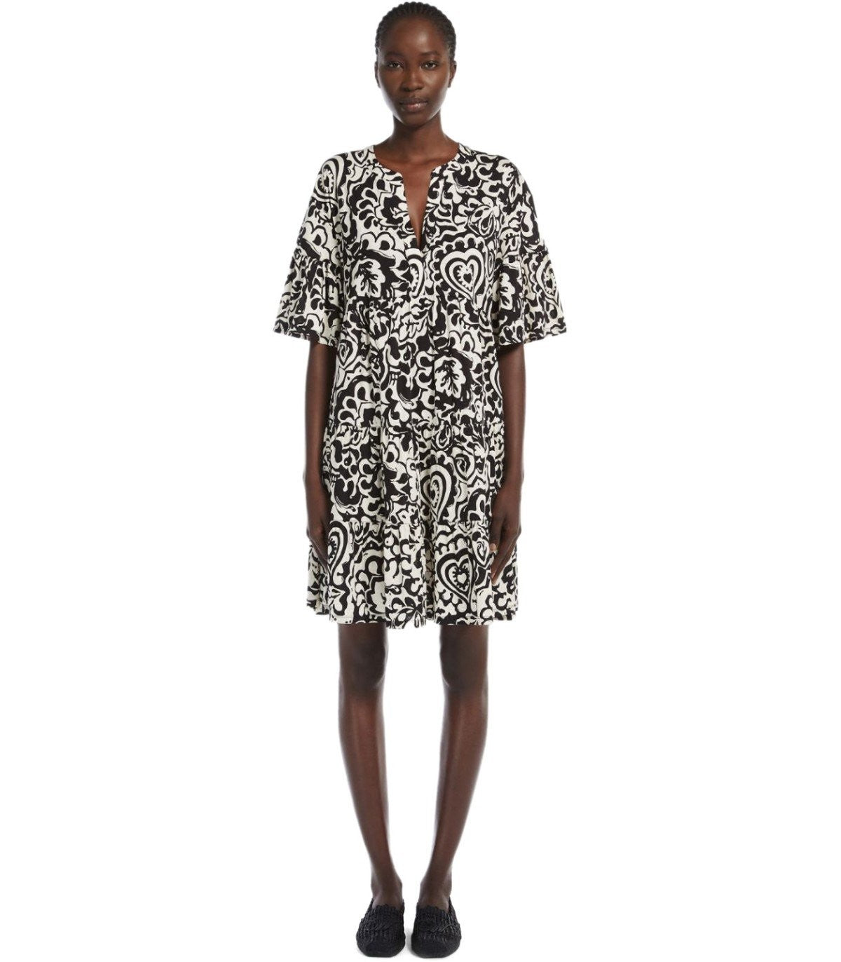 Ely short dress by Max Mara Weekend made of cotton jersey adorned with a printed tribal effect pattern in black and white tones. With a kaftan-style design, it features a V-cut on the front and a round neckline. It has short sleeves finished with ruffles at the bottom and a wide skirt with light ruffles at the hem, finished with a gathered motif at the waist. Loose fit. The model is wearing size M and is 179 cm tall. Composition: 100% cotton.