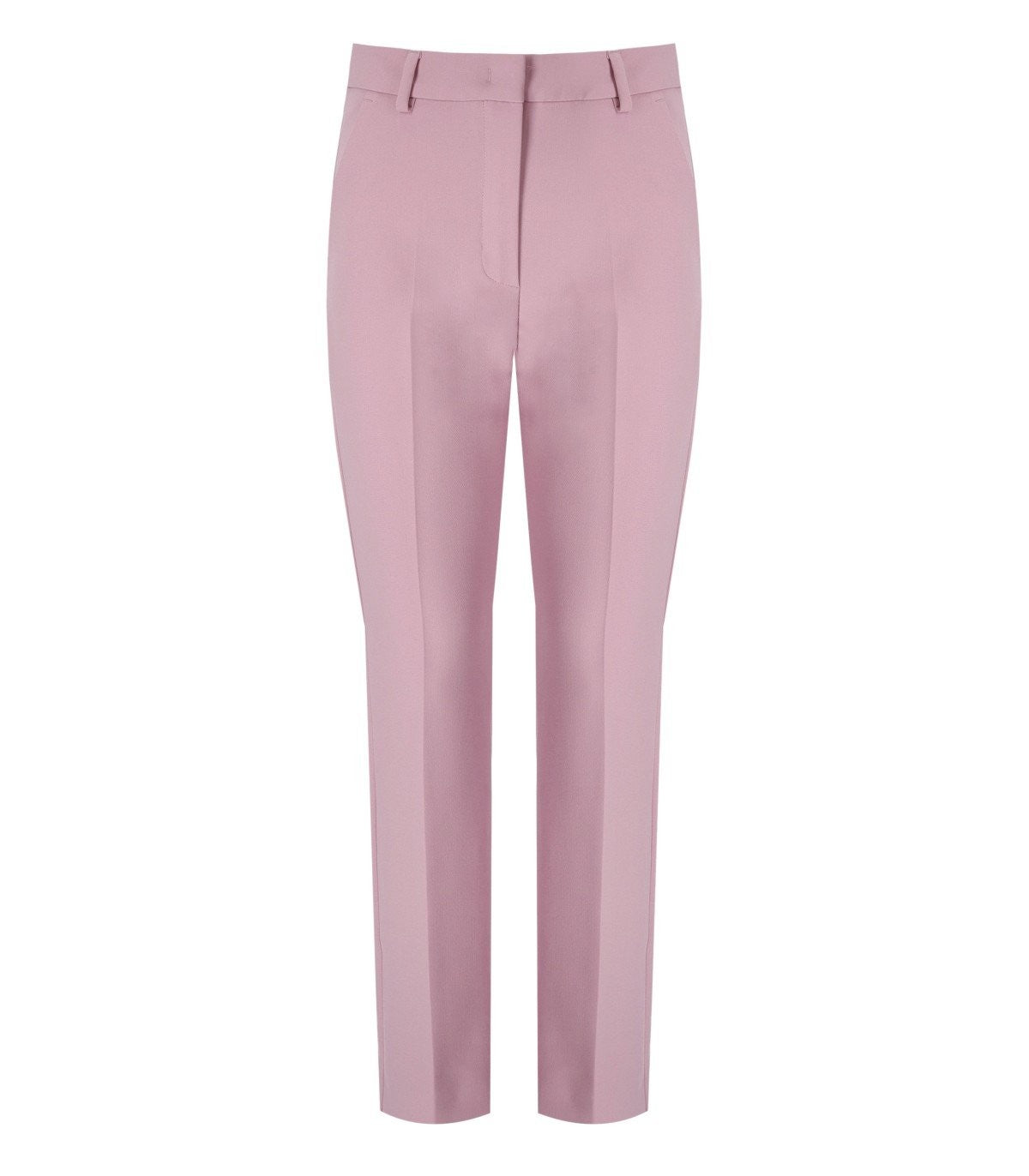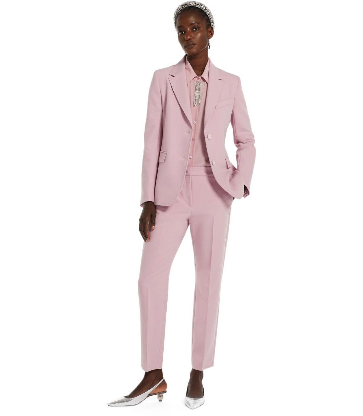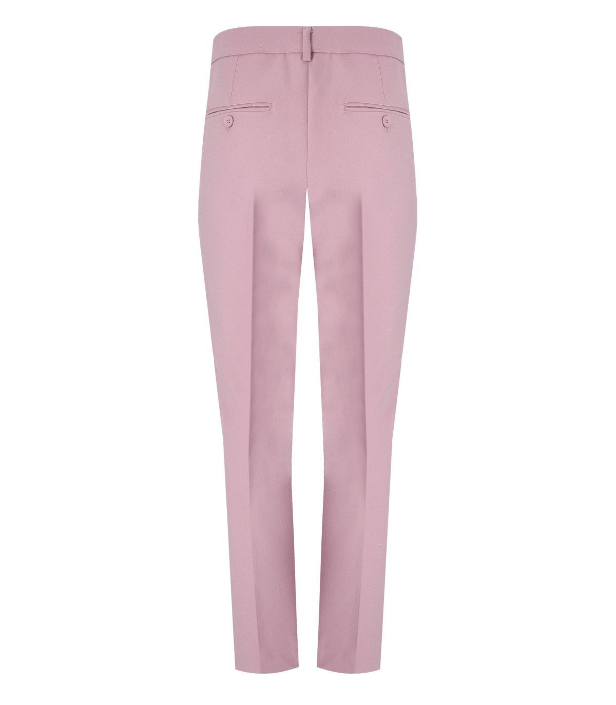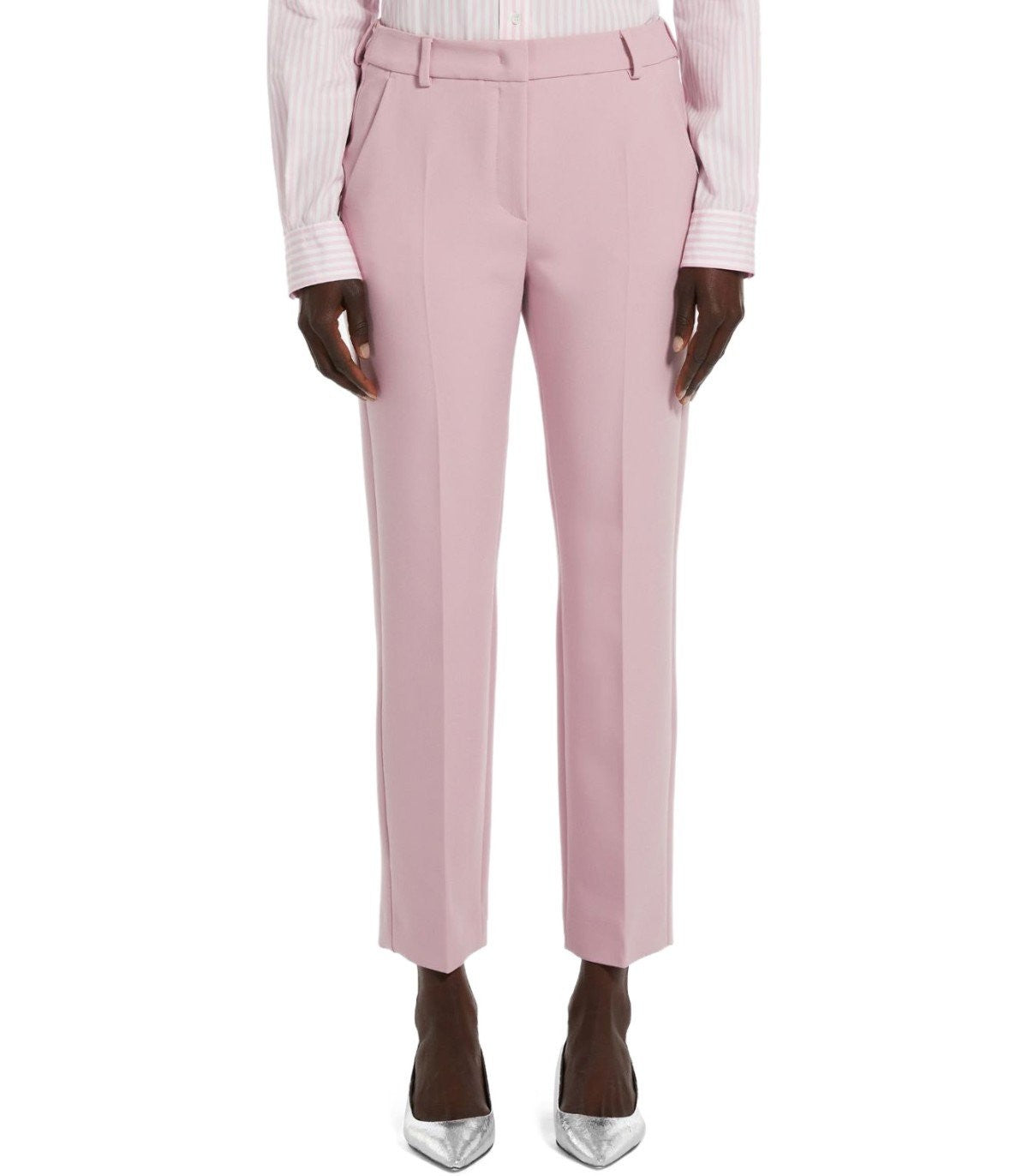 Max Mara Weekend Rana trousers, made in a pink viscose blend, are characterized by a classic cut and high waist. They feature French pockets on the sides, buttoned pockets on the back, belt loops, and a closure with a zip and metal hook. Slim fit, ankle length. The model is 178 cm tall and wears a size 40IT. Composition: 72% polyester, 21% viscose, 7% elastane.