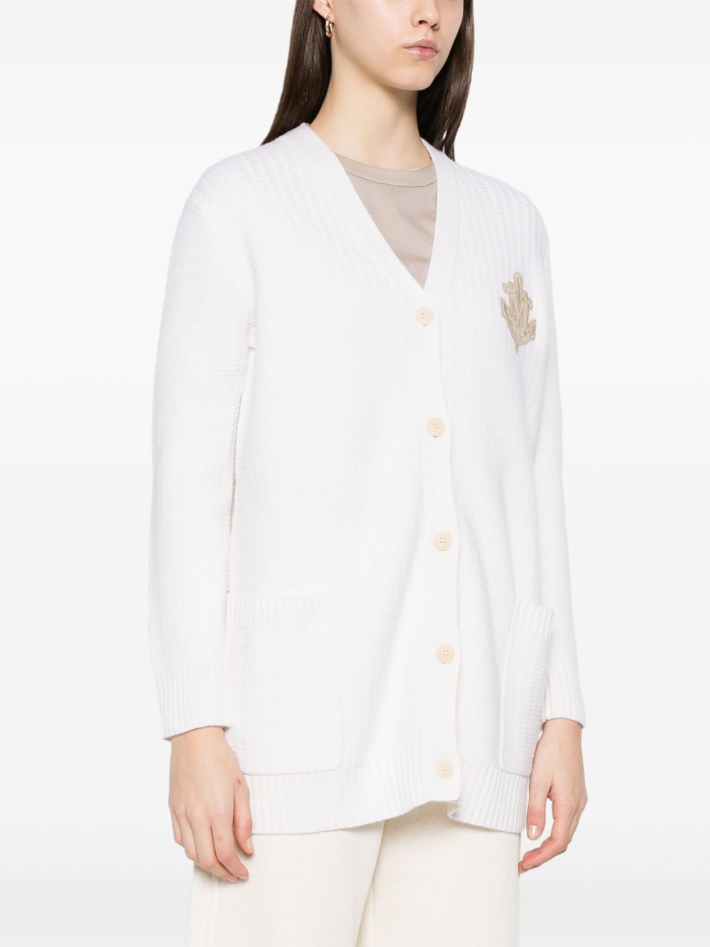 white front button fastening ribbed V-neck long sleeves two side patch pockets