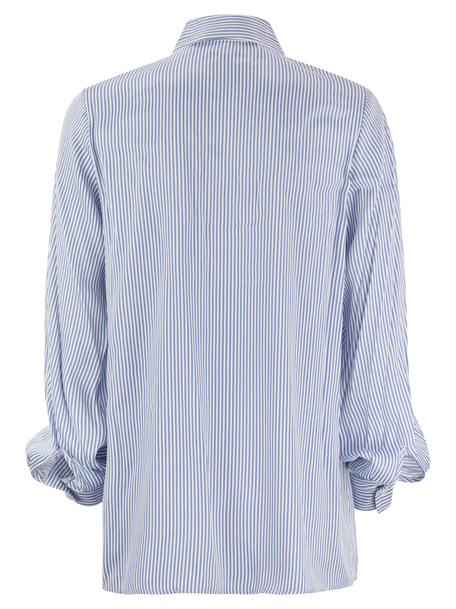 The striped pattern adds a refined touch to this elegant shirt. Made of viscose, it features a pointed collar and a front button placket. The lacing detail at the collar and the puff sleeves enhance the garment. Pair it with tailored trousers, leaving a few buttons undone. - Viscose - Button/tie fastening DESIGNER ID: MR440LCBA4 437