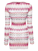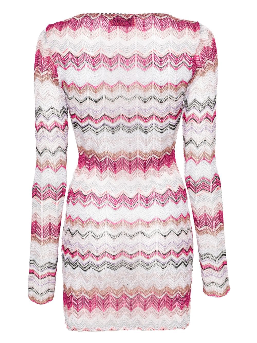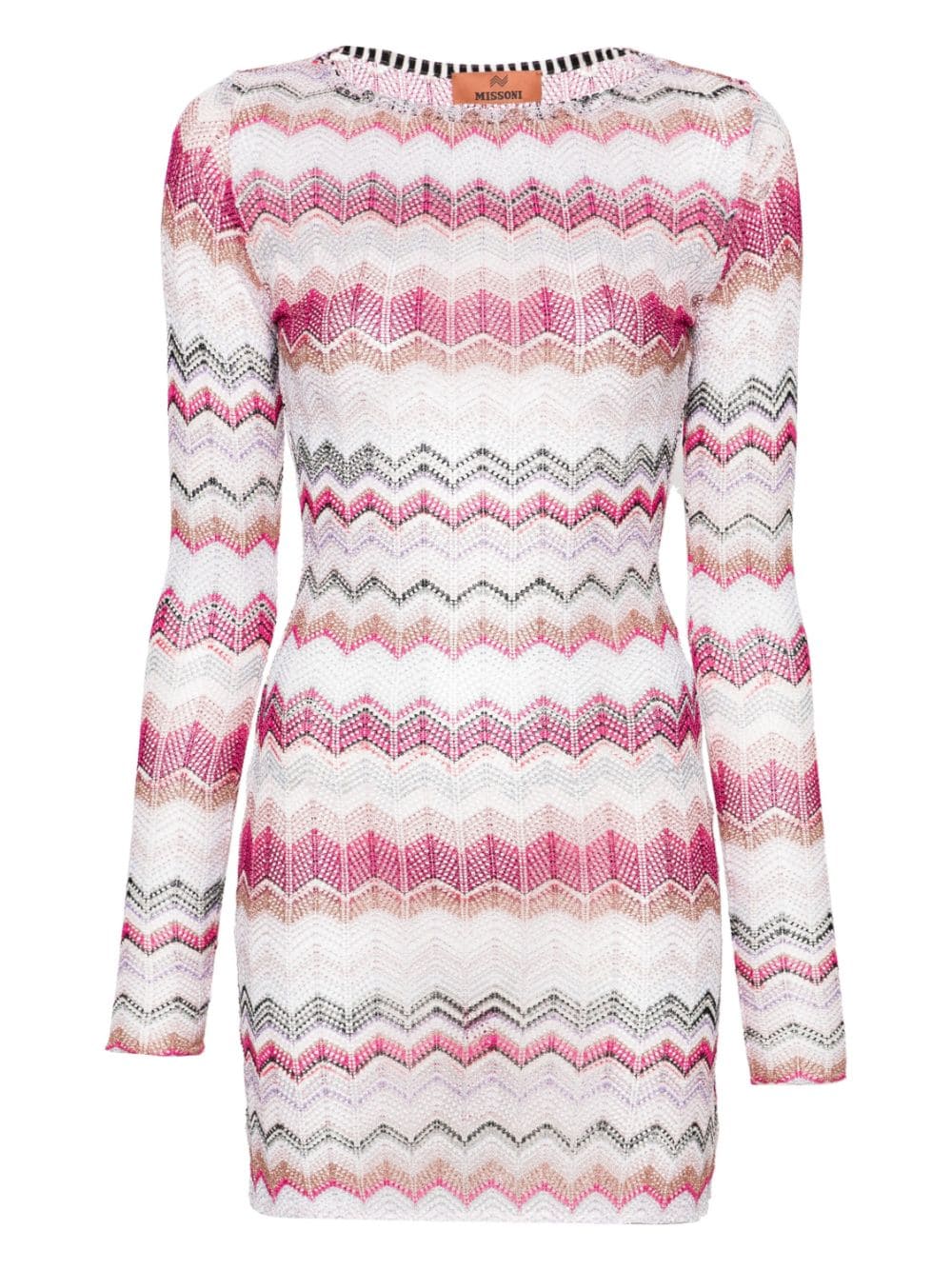 white/multicolour knitted construction crochet knit signature zigzag woven design lurex detailing fully perforated round neck long sleeves straight hem thigh-length The item you receive may differ slightly from the item photographed. This is due to the artisanal nature with which all Missoni products are constructed.