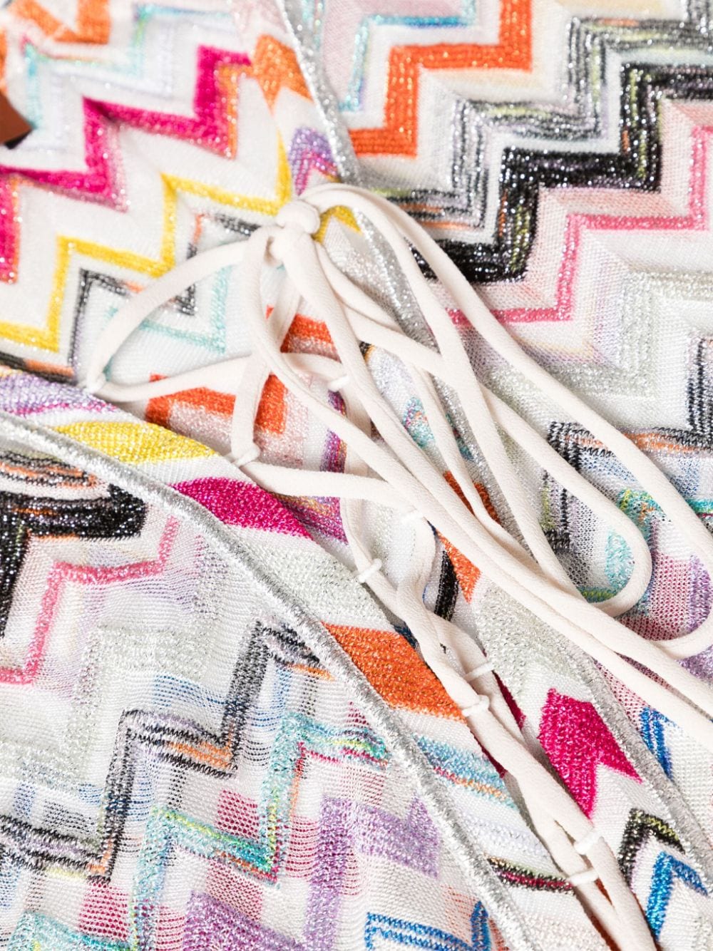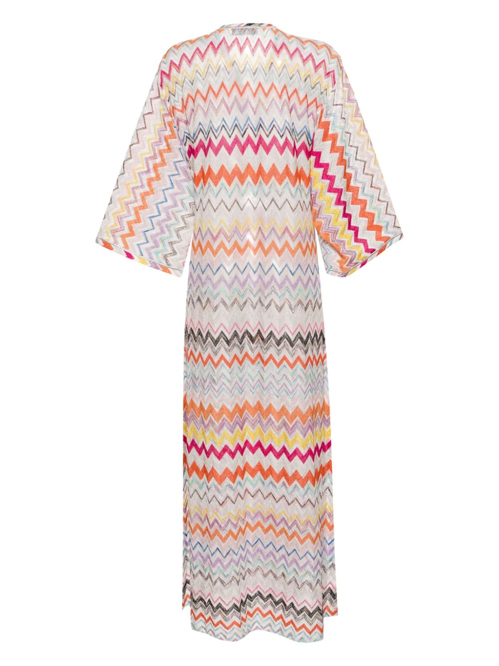 white/multicolour lurex detailing signature zigzag woven design plunging V-neck crossover strap detail drop shoulder three-quarter length sleeves long length two thigh-high side slits straight hem unlined self-tie fastening The item you receive may differ slightly from the item photographed. This is due to the artisanal nature with which all Missoni products are constructed.