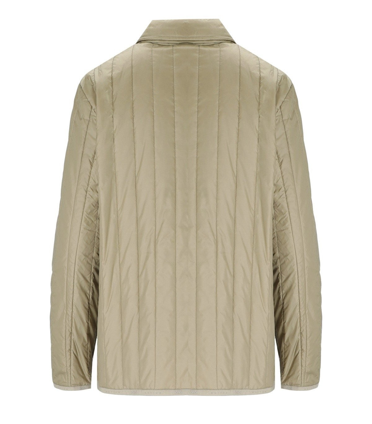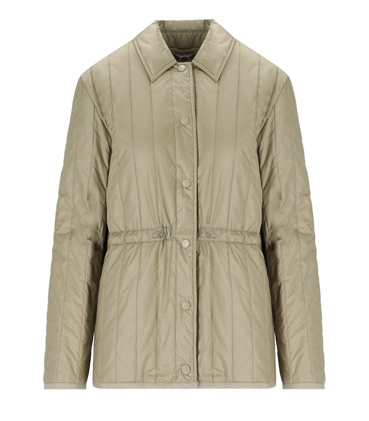 Short padded jacket Eritrea by MM Max Mara made of nylon in shades of beige. Characterized by an all-over vertical striped pattern, it features a button closure, shirt collar, long raglan sleeves with branded cuffs. It has invisible side pockets with zippers and an adjustable drawstring at the waist. Regular fit. Composition: 49% polyester, 46% camel, 5% silk; lining: 100% polyamide.