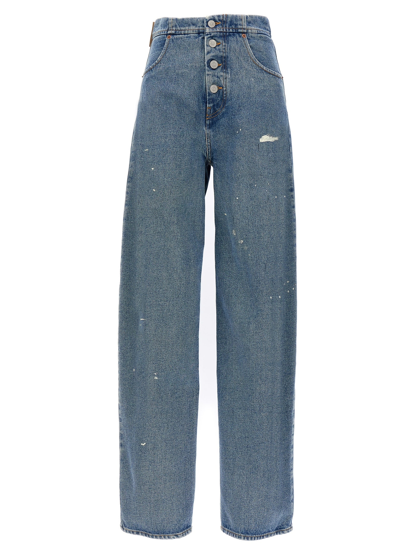 Baggy medium waist denim jeans with button closure, wide leg with small splashes of paint. Please note that the models may differ from each other, paint splashes other than those in the picture are not considered a defect.
