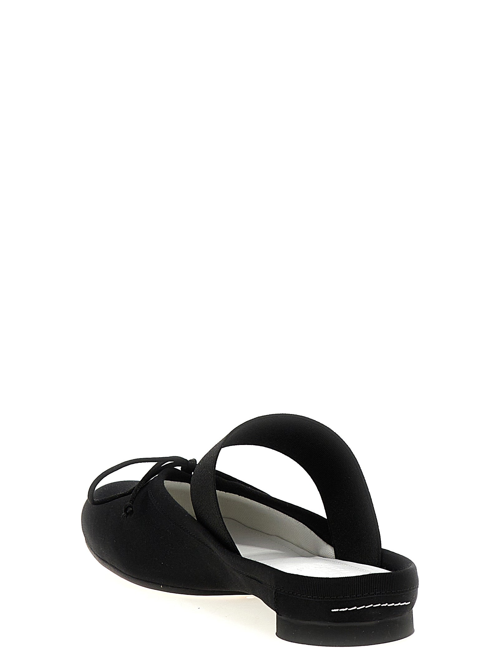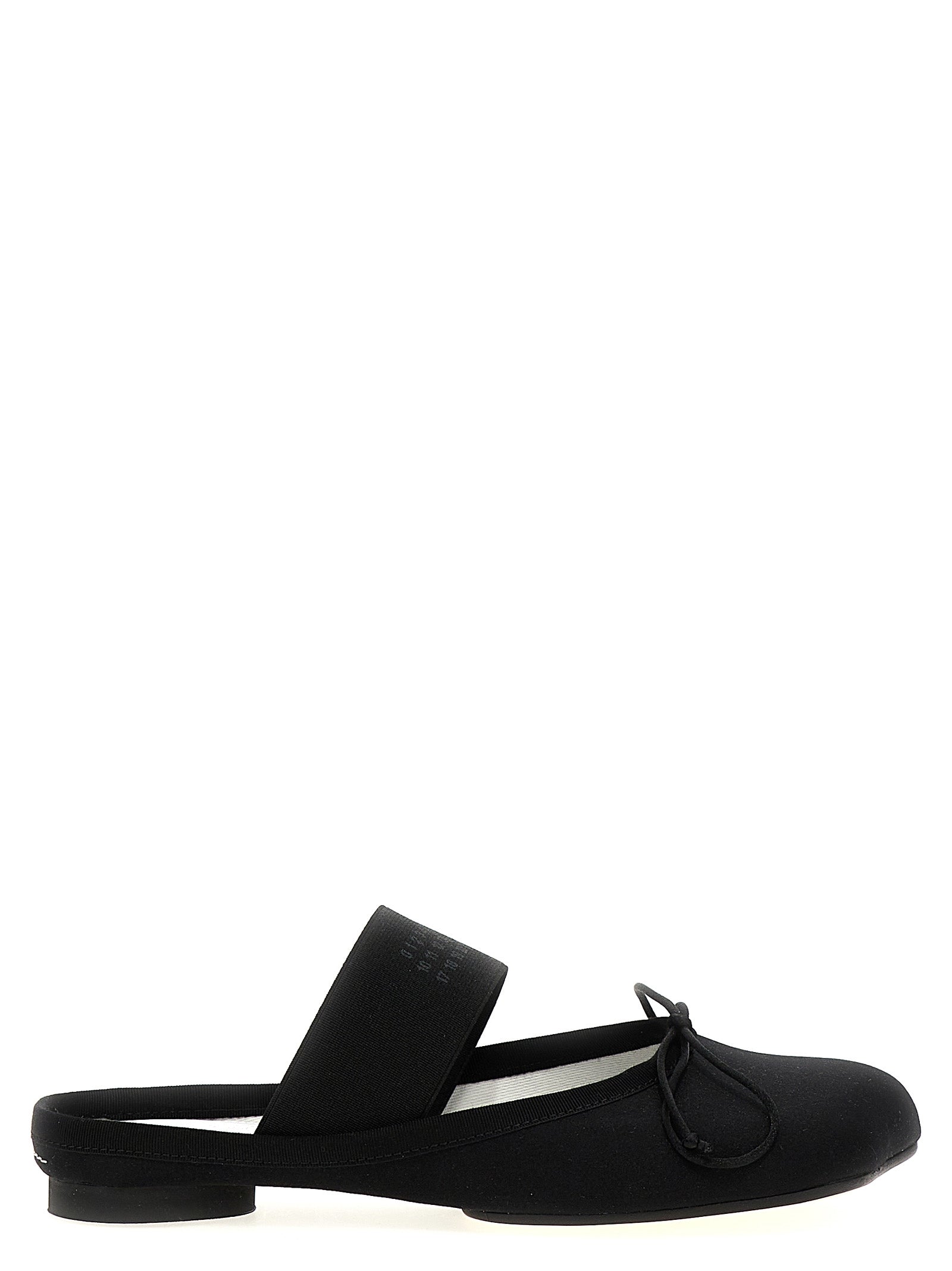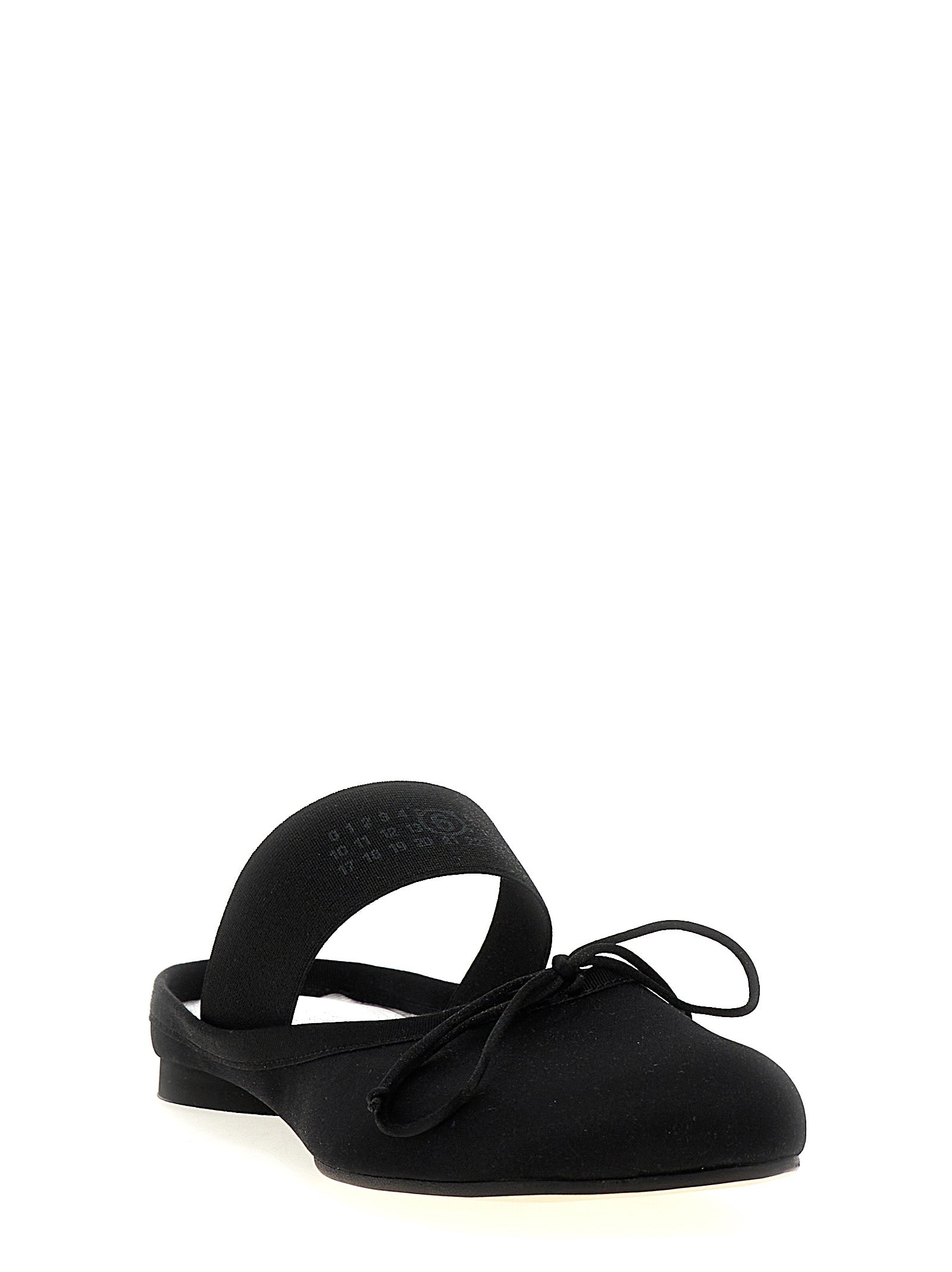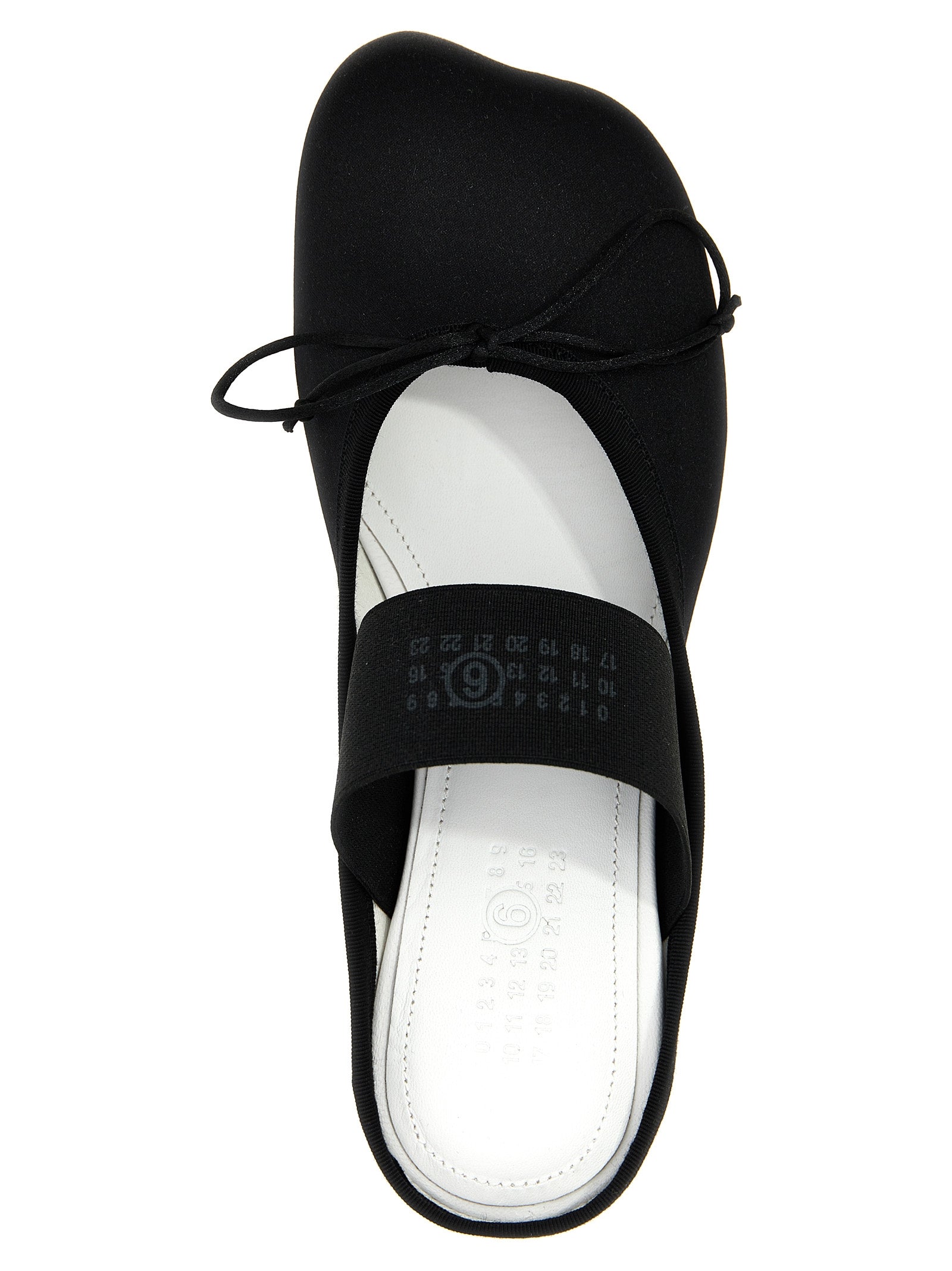 Satin ballet flats with 'Anatomic MM6' shape, 'Slip-On' model, front bow, elastic strap with 'Numeric Signature MM6', 'White stitch line' at the back, cylindrical heel, leather sole.