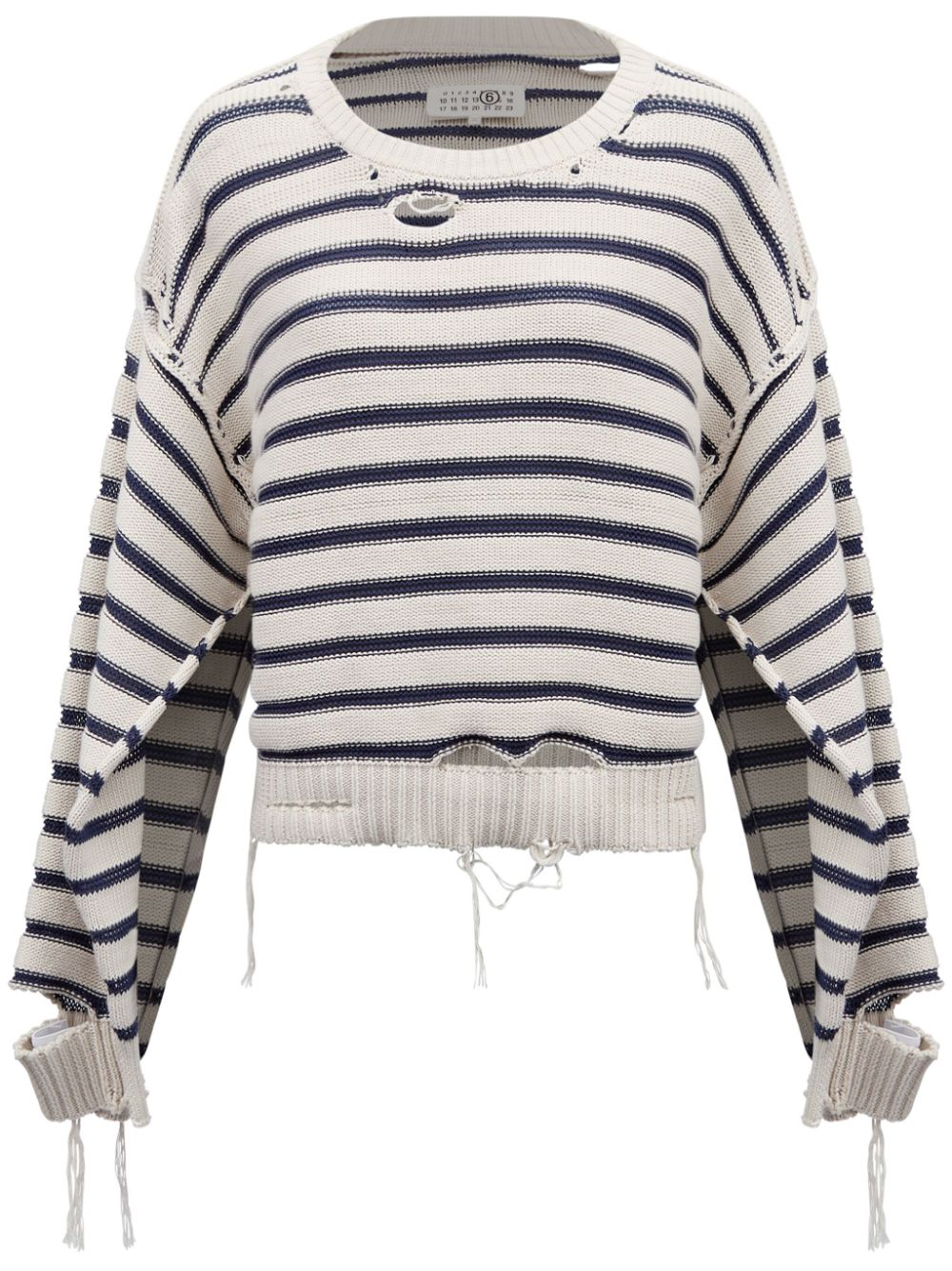 white/blue cotton knitted construction crew neck long sleeves ribbed cuffs and hem distressed finish