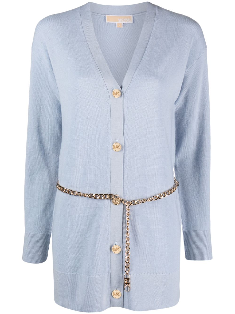 light blue merino wool ribbed knit logo plaque to the rear chain-link belted waist V-neck front button fastening long sleeves ribbed cuffs and hem straight hem long length gold-tone hardware