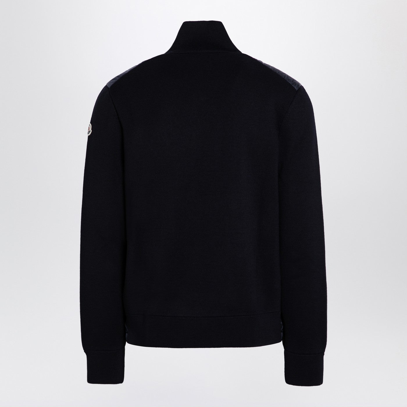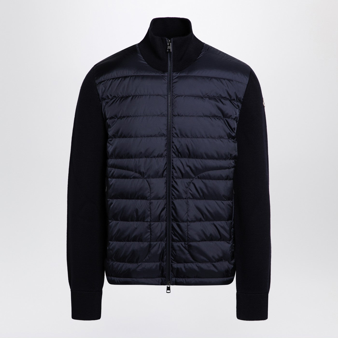 Black quilted nylon cardigan from Moncler featuring wool-blend sleeves with logo patch, double zip front fastening, high collar, side welt pockets with zip and ribbed cuffs.