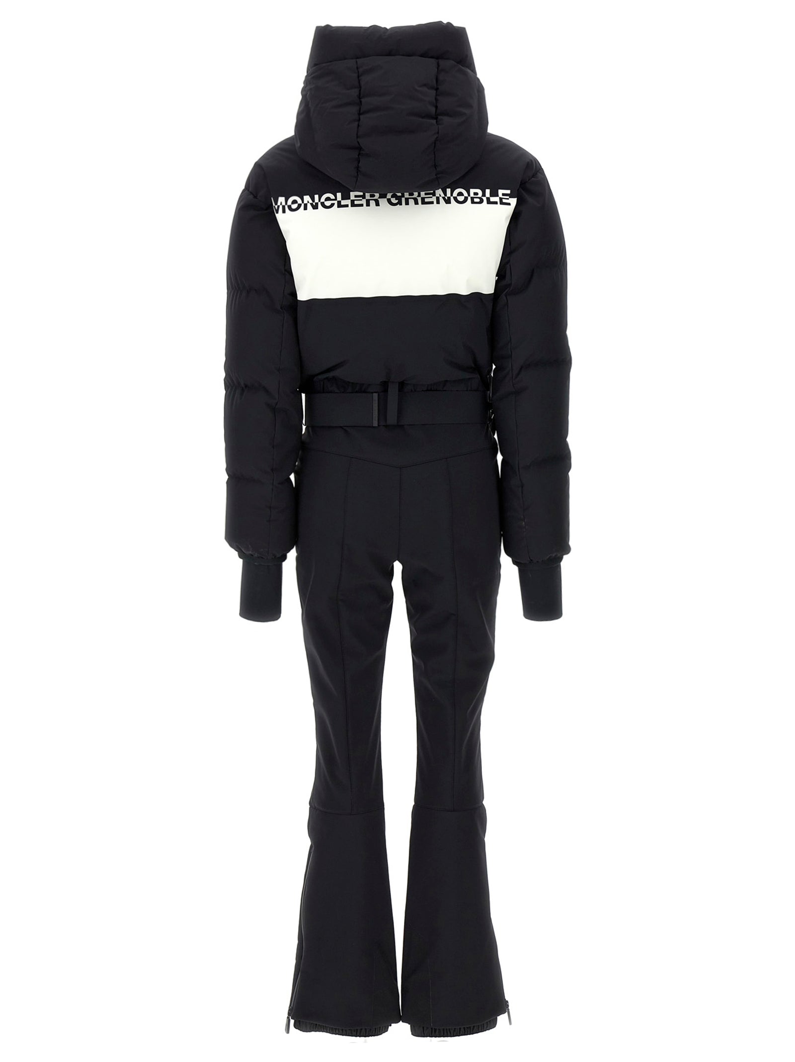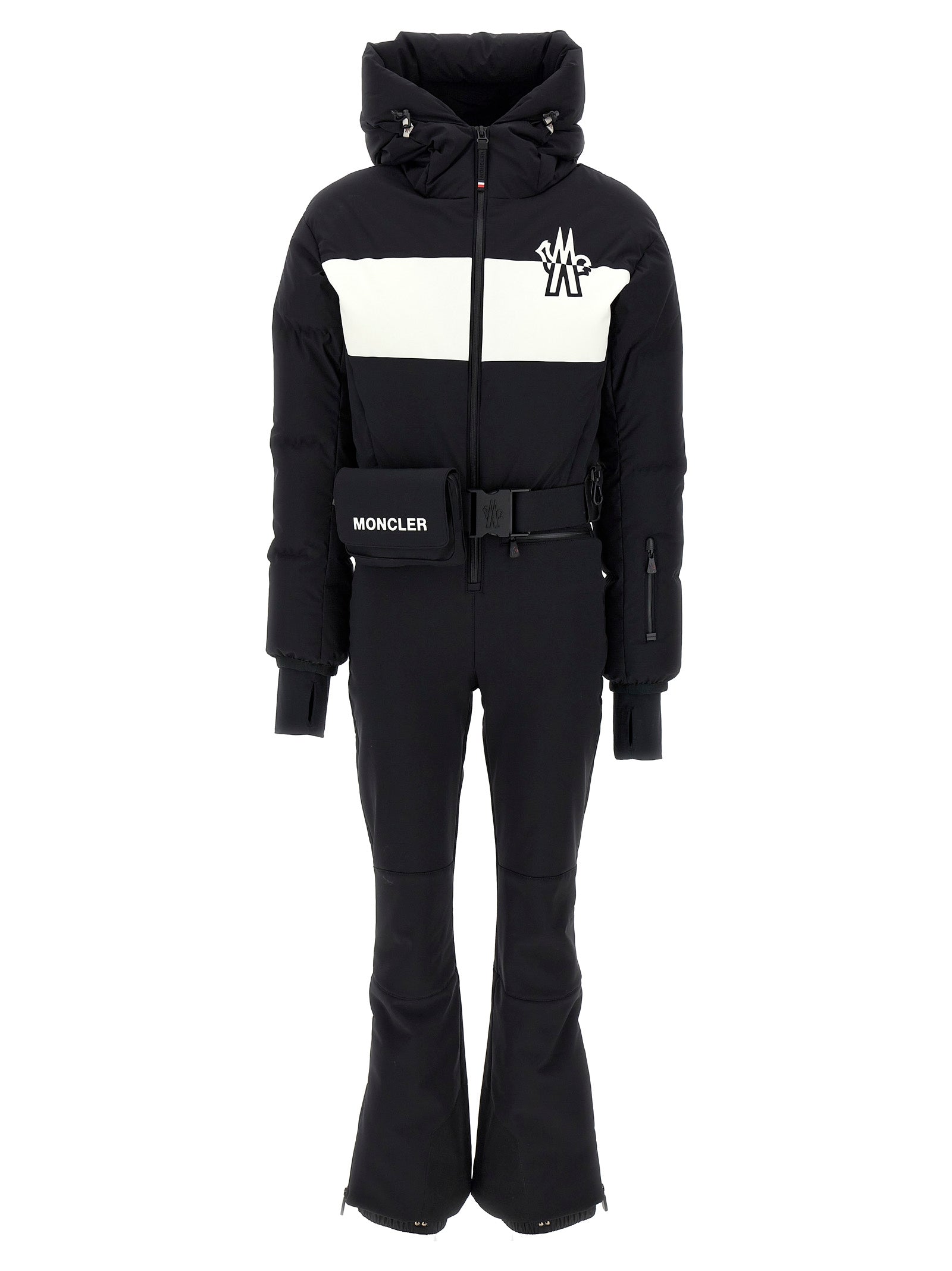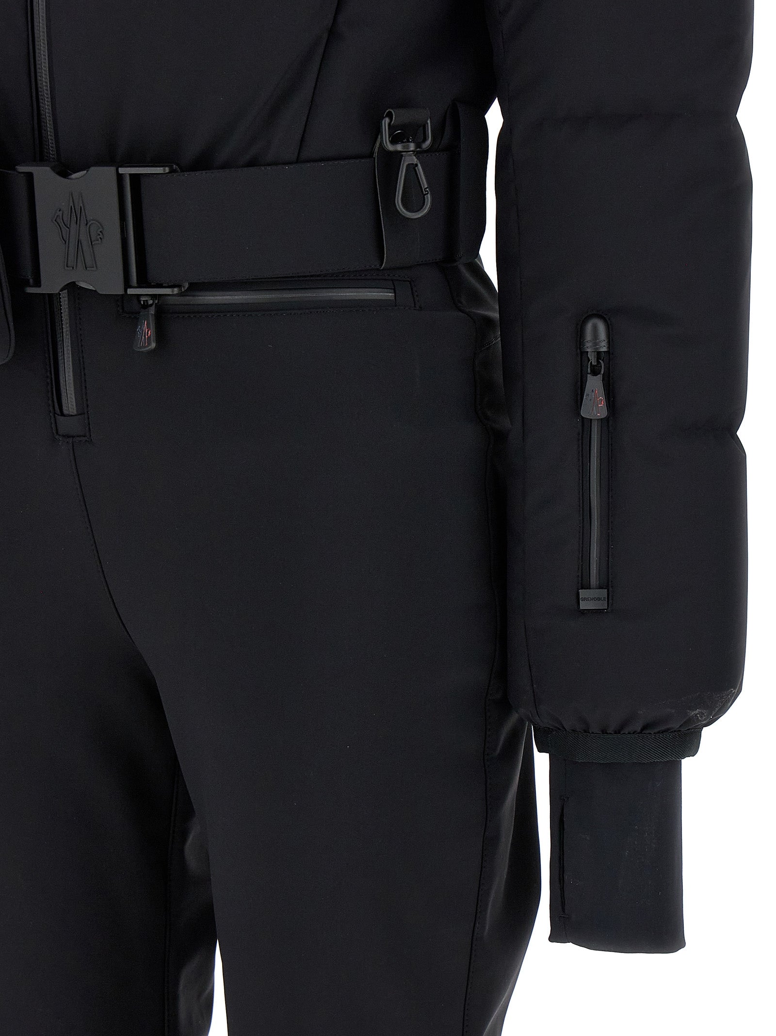 Technical nylon down-padded ski suit with hood, zip closure, removable waist belt with ski pass pocket, pockets, long sleeves with cuffs, long leg with zip detail on the bottom.