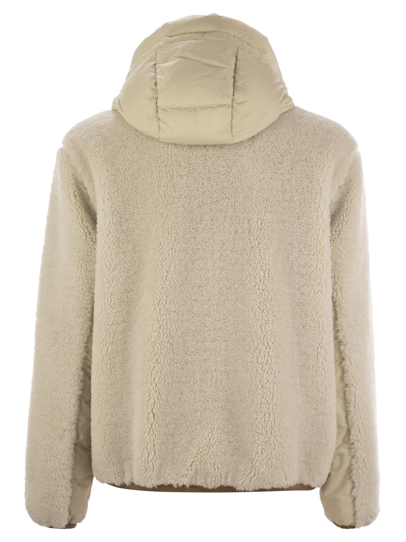Perfect for relaxation and adventures, the Wengi down jacket is a reversible garment. One side of the short down jacket is made of soft, teddy-effect fleece, while the other side is made of water-repellent nylon. For extra protection from the cold, the garment is completed by a removable hood. - Windproof - Maintains body heat with a windproof action. - Insulating - Performs a thermoregulating action and offers excellent breathability. - Breathable - Allows breathability, reducing perspiration and maintaining warmth. - Activity - Après ski - Made of teddy effect fleece - Rainwear lining - Reversible - Down filled - Removable hood - Zip closure - Inside pockets with snap button - Logo label - Regular fit - Straight cut DESIGNER ID: J20971A00033899PO 215