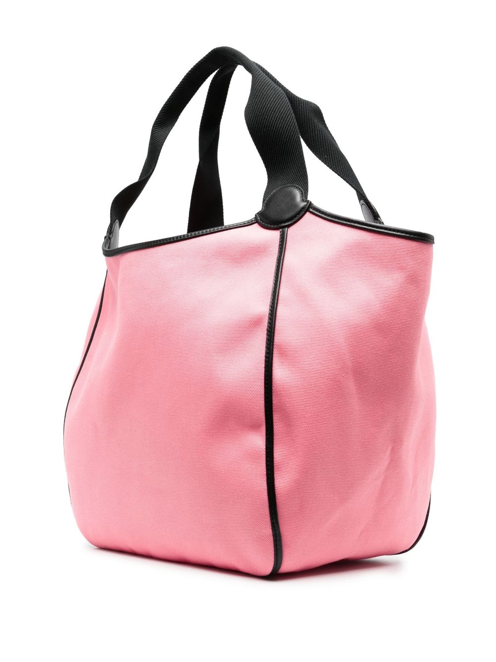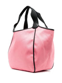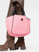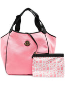 logo-patch tote bag from MONCLER featuring rose pink, leather trim, logo patch to the front, two long top handles, top zip fastening and main compartment.