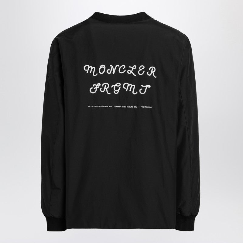 Moncler Genius X FRGMT jacket by Hiroshi Fujiwara in black cotton and nylon blend, characterized by a V-neck, long sleeves with ribbed cuffs and logo patch, front closure with snap buttons and contrasting logo embroidery on the chest and back.