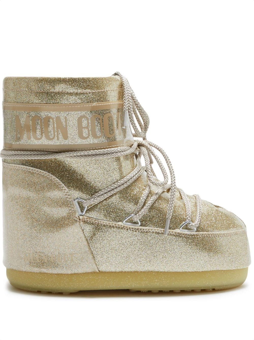 Icon Low Glitter boots from MOON BOOT featuring gold-tone, glitter detailing, water-repellent, padded design, logo-print strap, metal eyelet detailing, full lining, top drawstring fastening, front lace-up fastening, round toe, ankle-length, flat rubber sole and slip-on style.