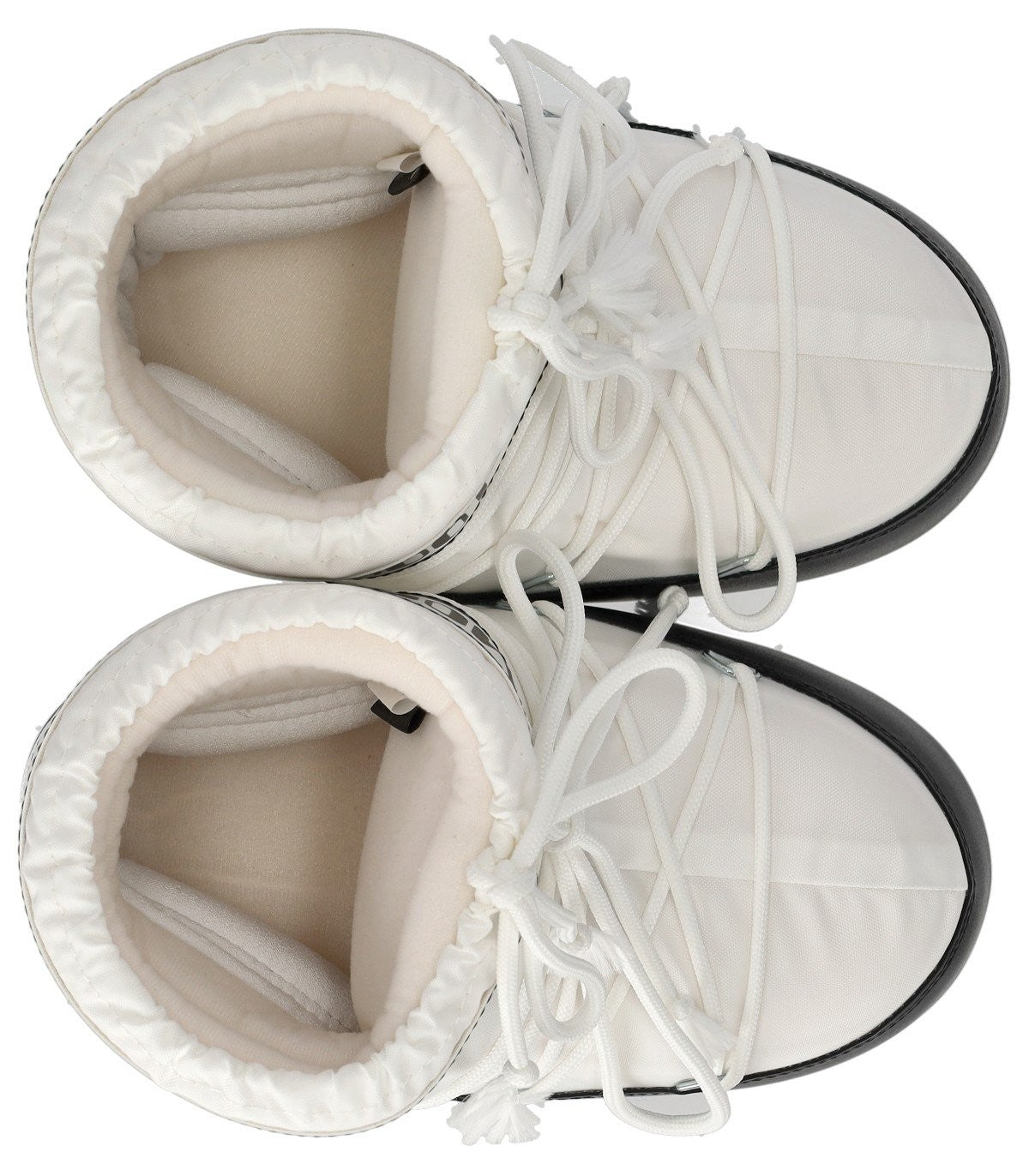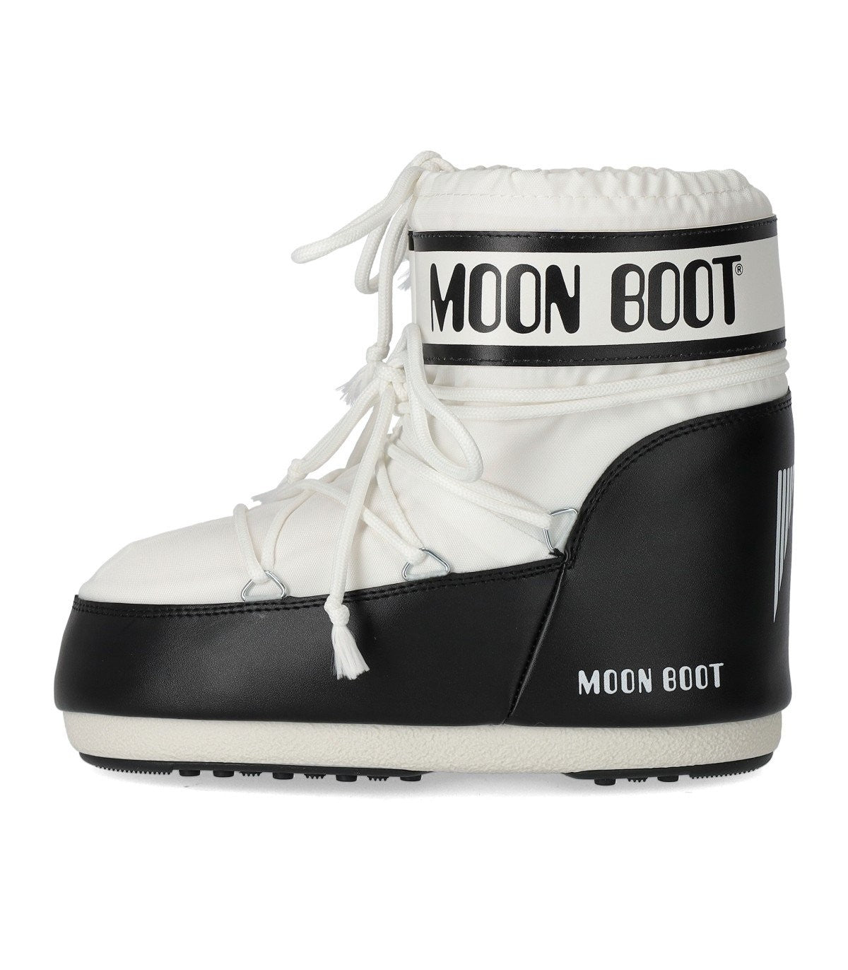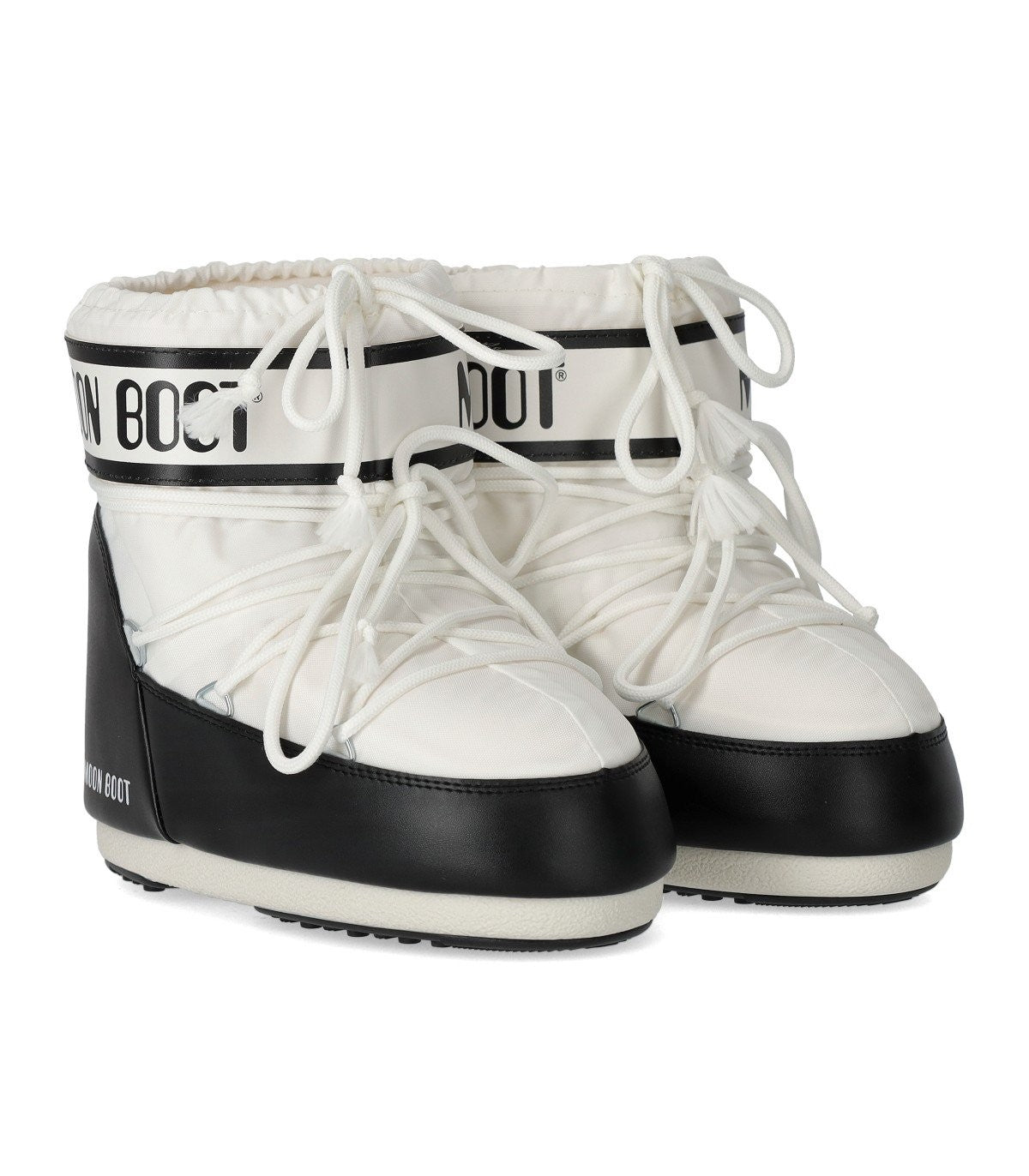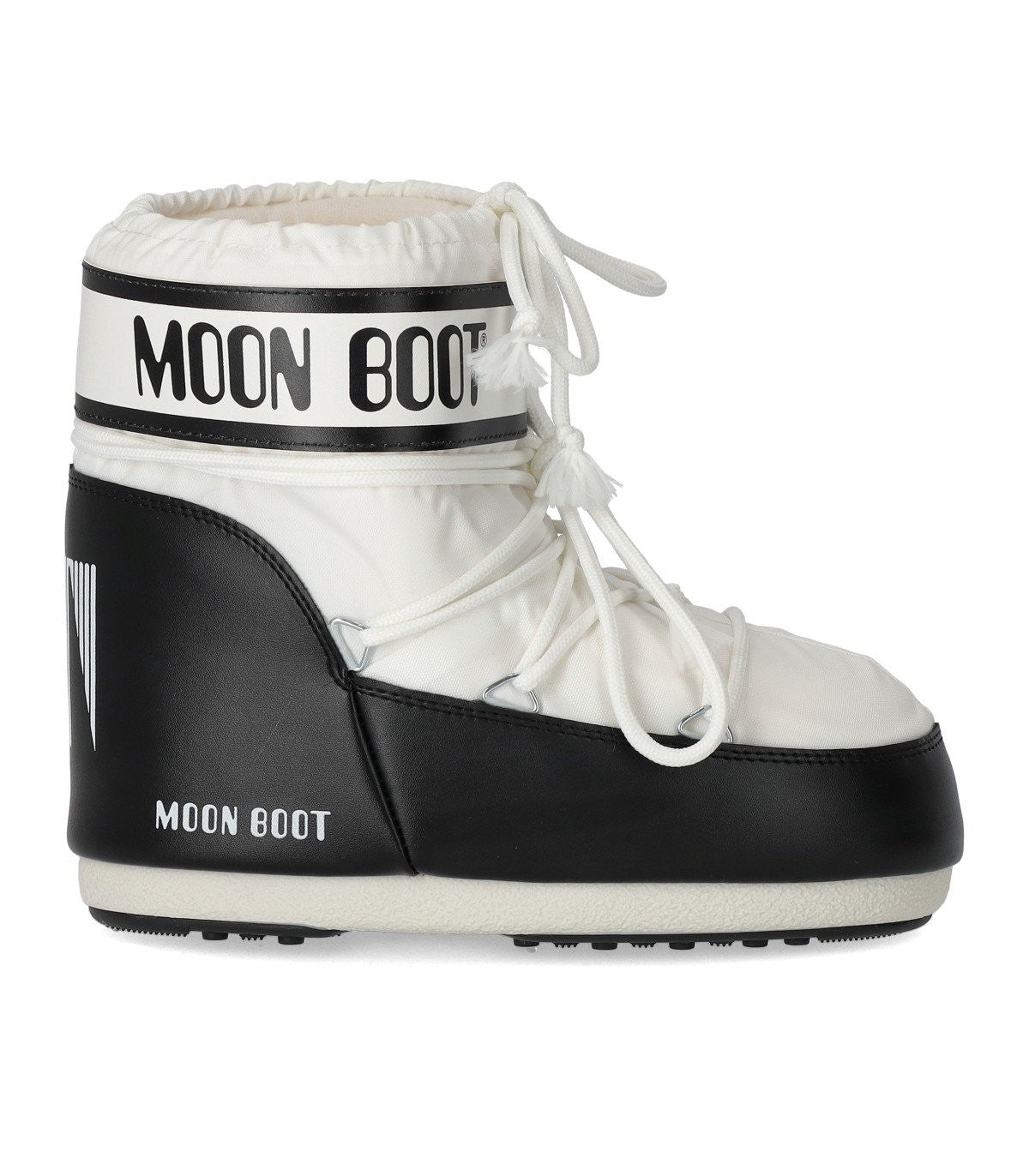 Icon Low snow boot by Moon Boot made of nylon in shades of white and black. Ambidextrous, it features a strap with logo. Equipped with crisscross tubular laces finished with silver metal eyelets, it has an adjustable drawstring. Thermoplastic rubber midsole adorned with printed logos. Contrasting PVC heel and trims. Non-slip rubber outsole. Outsole height, 2 cm. This model has a small fit, if you are between two sizes, we recommend purchasing the larger size. Composition: 100% nylon; trims: 100% PVC; lining: 100% polyester; midsole: 100% thermoplastic rubber; sole: 100% rubber.