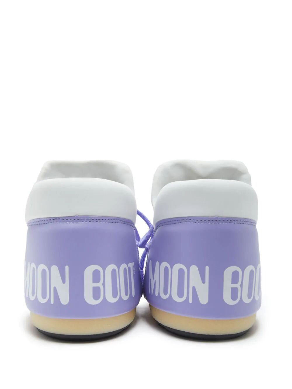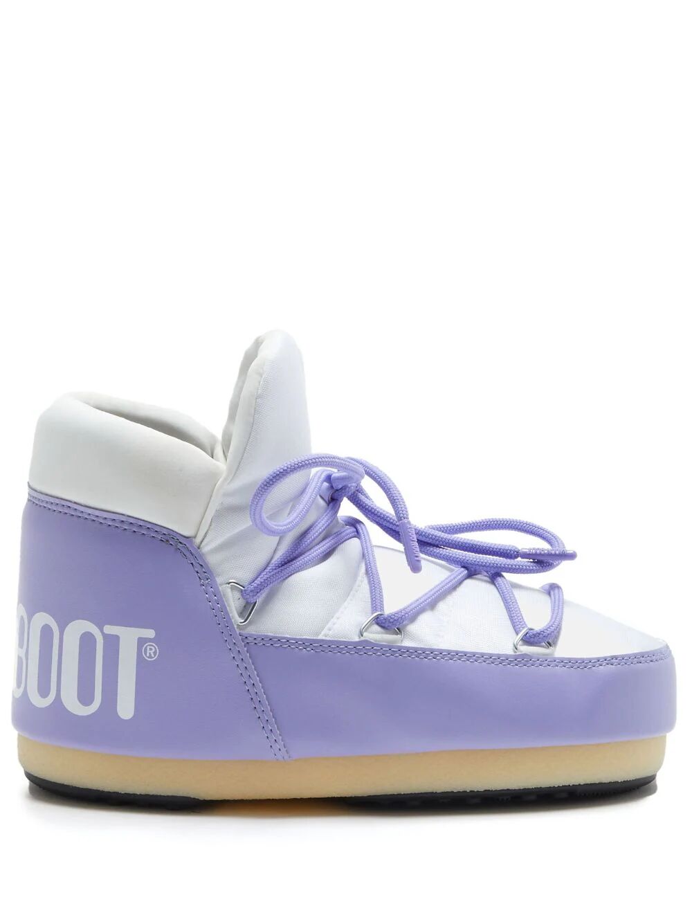 two-tone padded lace-up boots from MOON BOOT featuring lilac purple, white, padded design, water-repellent finish, logo print to the rear, round toe, front lace-up fastening, ankle-length and flat rubber sole.