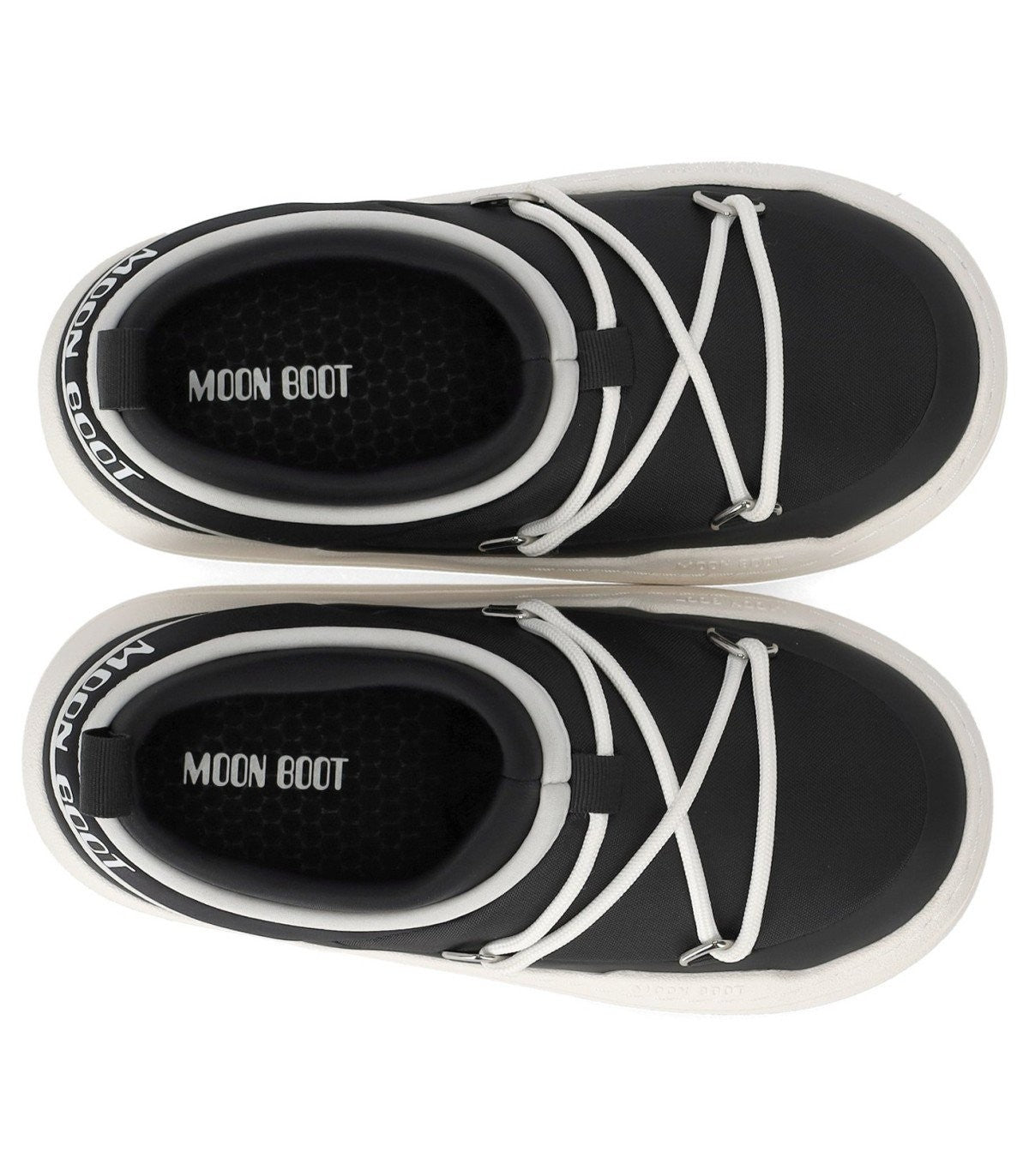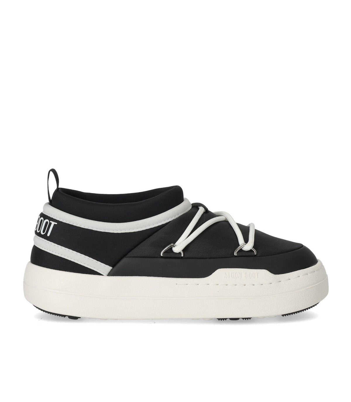 Park Icon sneaker by Moon Boot made of nylon, in shades of black and white. Ambidextrous, with a genderless slip-on design, it features a heel pull tab and a printed logo on the back. Crossed tubular laces, finished with silver metal eyelets. Interior in polyester fabric and EVA insole with embossed logo. Non-slip rubber sole, with branded prints. Sole height, 3 cm. This item has a small fit, we recommend purchasing one size larger than usual. Upper composition: 84% nylon, 16% polyurethane; lining: 100% polyester; outsole: 85% EVA, 15% thermoplastic rubber.