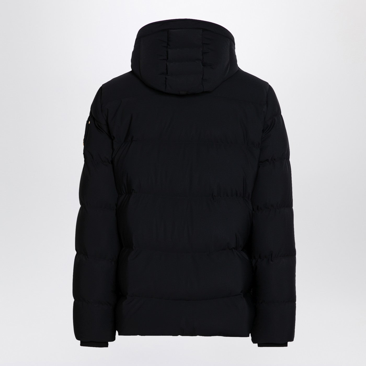 Black quilted nylon blend jacket from Moose Knuckles featuring a front zip and snap button fastening, a high collar, a hood with a removable drawstring, long sleeves with gold logo detail, two side welt pockets and two patch pockets on the chest with flaps.