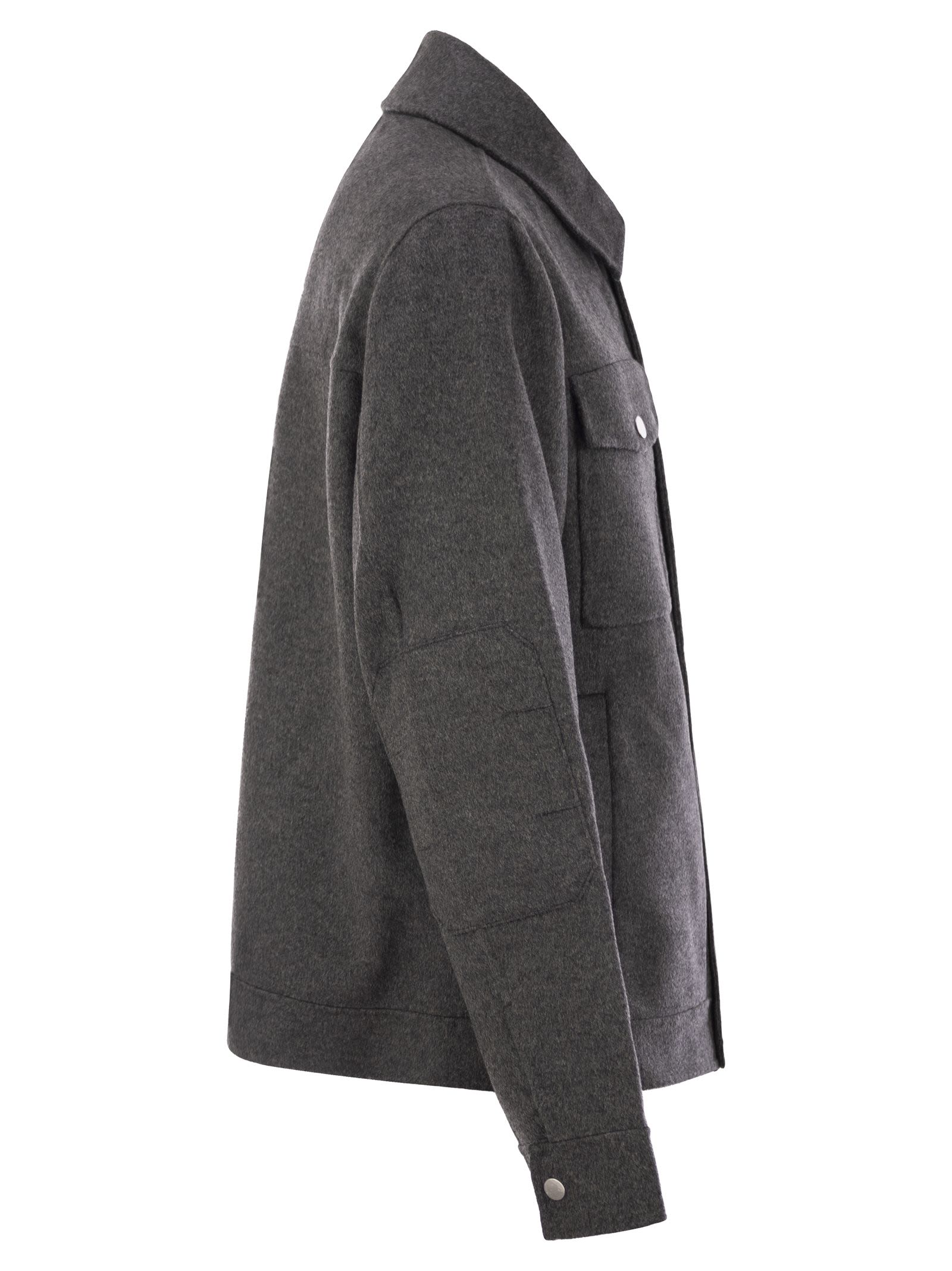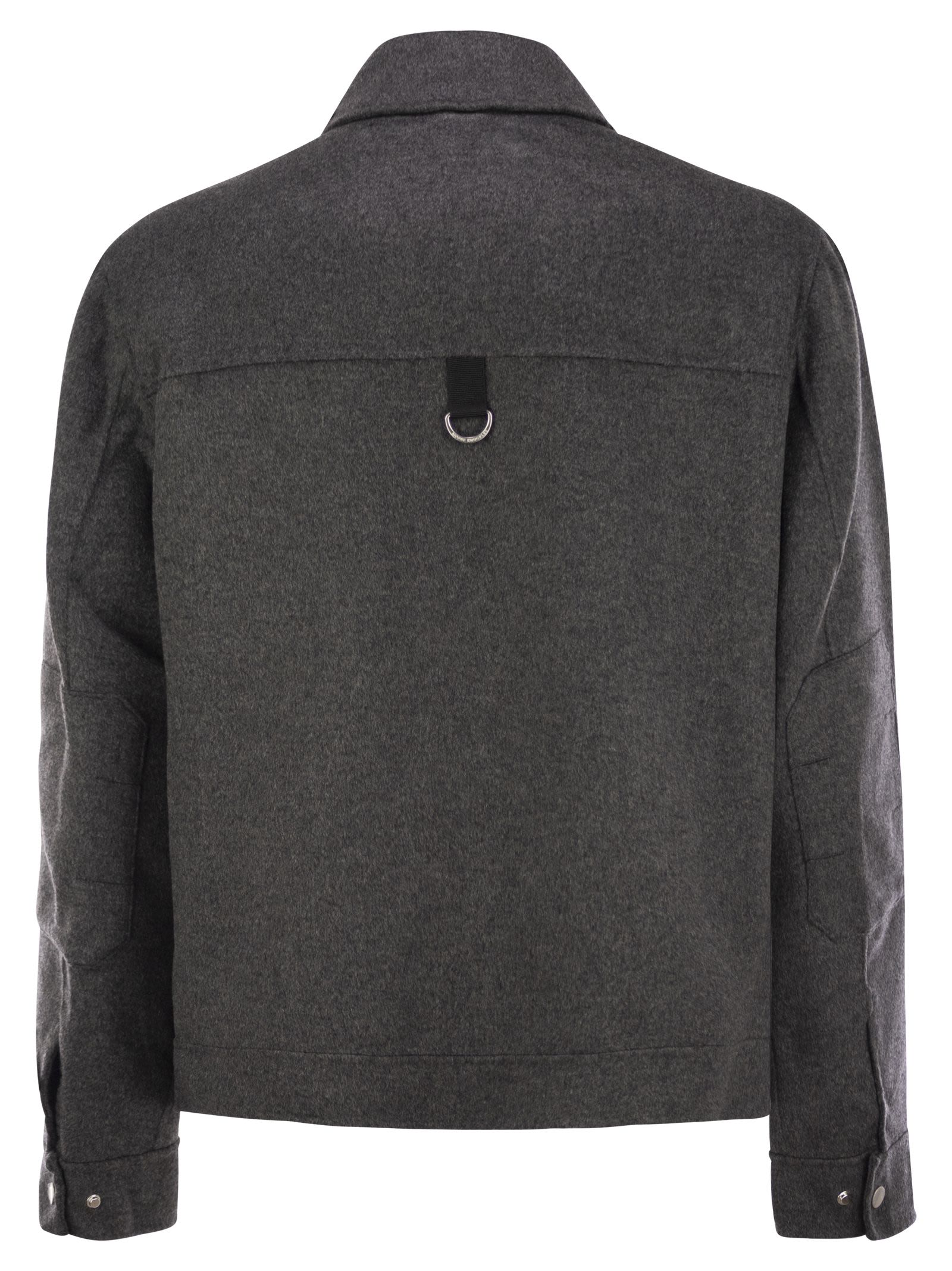 Elevate your wardrobe with the wool and cashmere shirt-jacket, designed with a tailored fit and a contemporary cropped hem. This refined garment offers the perfect blend of luxury and modern style. - Regular fit: Regular is an understated silhouette, cut with room for movement at the chest and arms. It offers greater agility without sacrificing structure and fits comfortably in mid-weight layers. - Shirt collar - 2-way closure with logo puller - 2 patch pockets with flaps and snap fasteners on chest and 2 pockets below the waist DESIGNER ID: M34MJ216 204