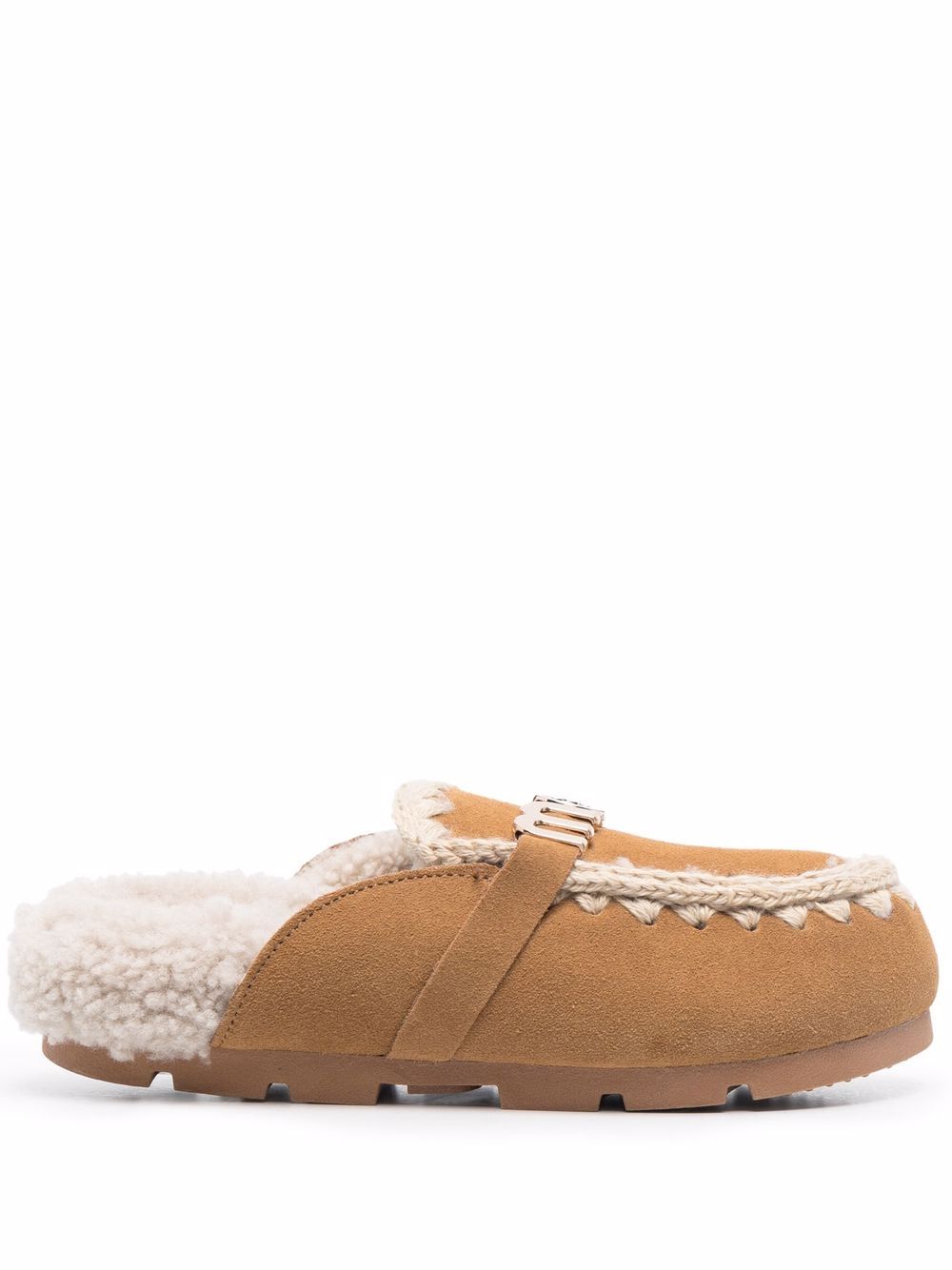 tobacco brown bos taurus/sheep skin shearling lining logo plaque round toe branded insole flat rubber sole