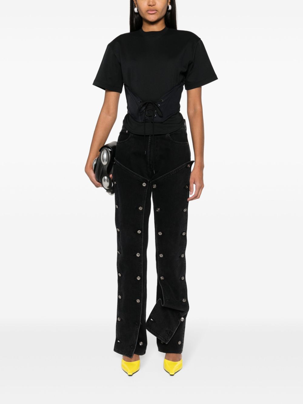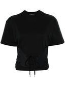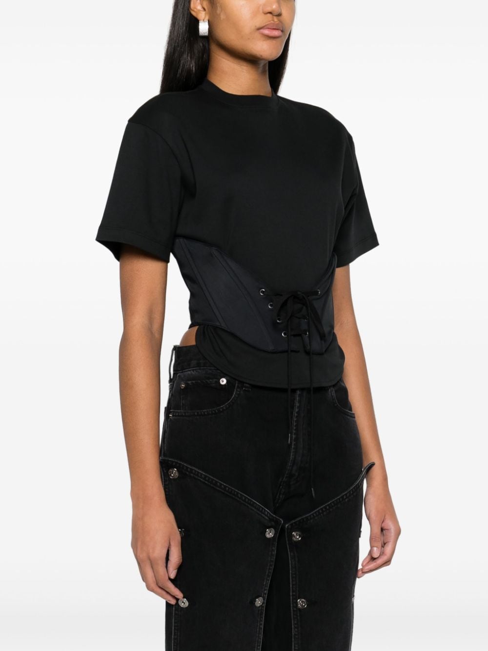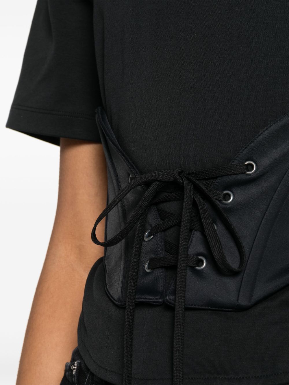 black cotton jersey texture panelled design corset style round neck short sleeves high-low hem front tie fastening