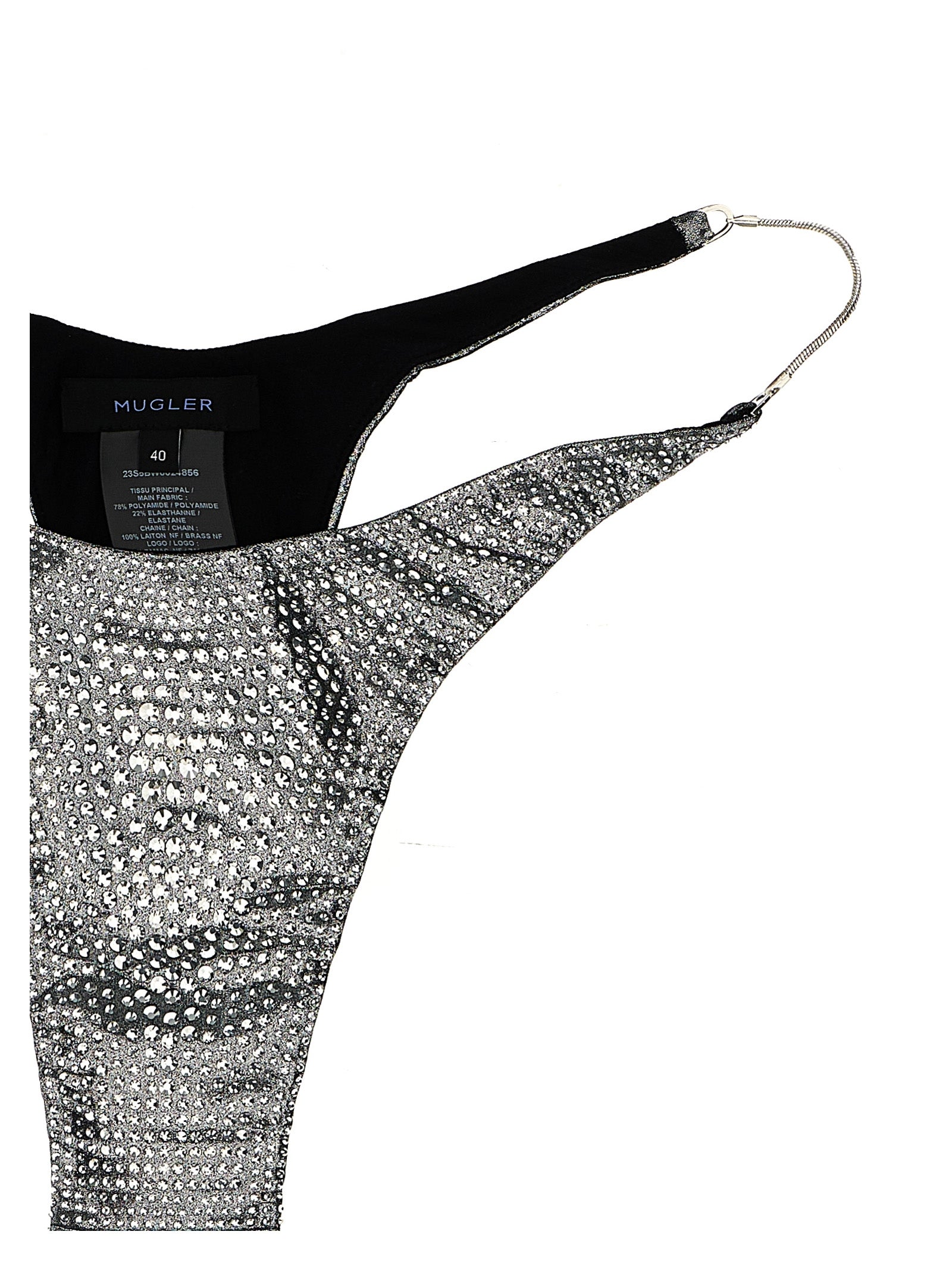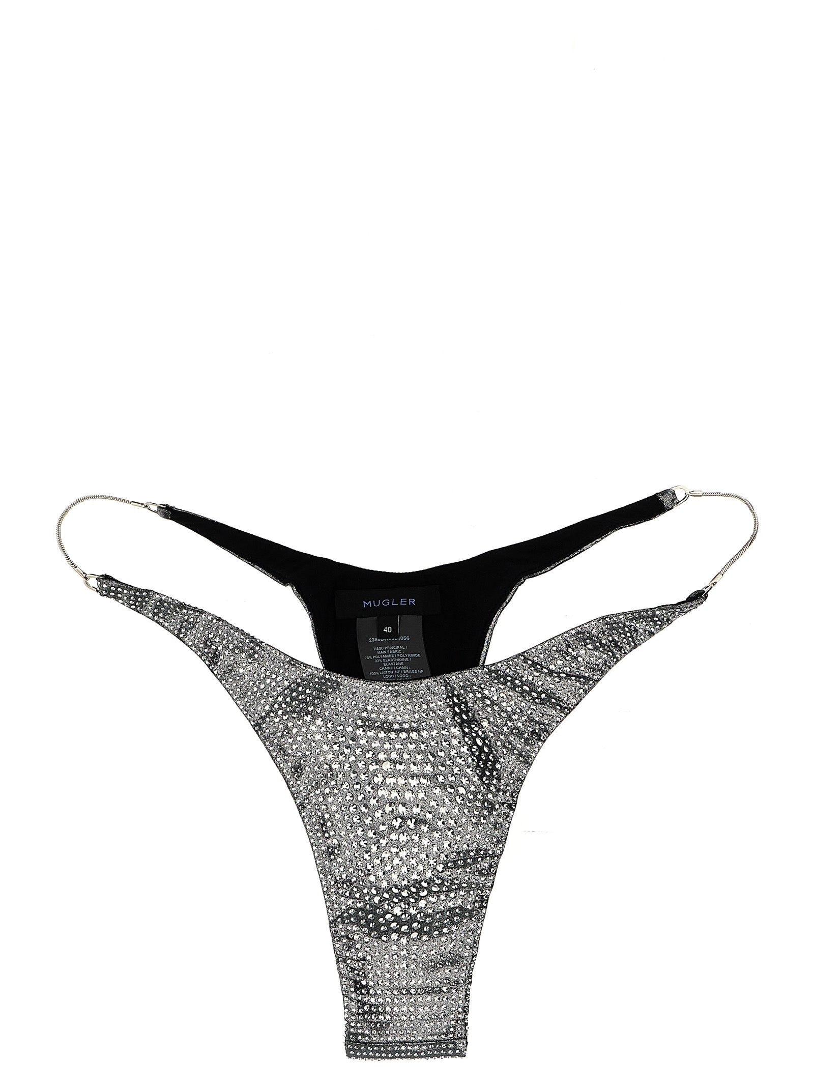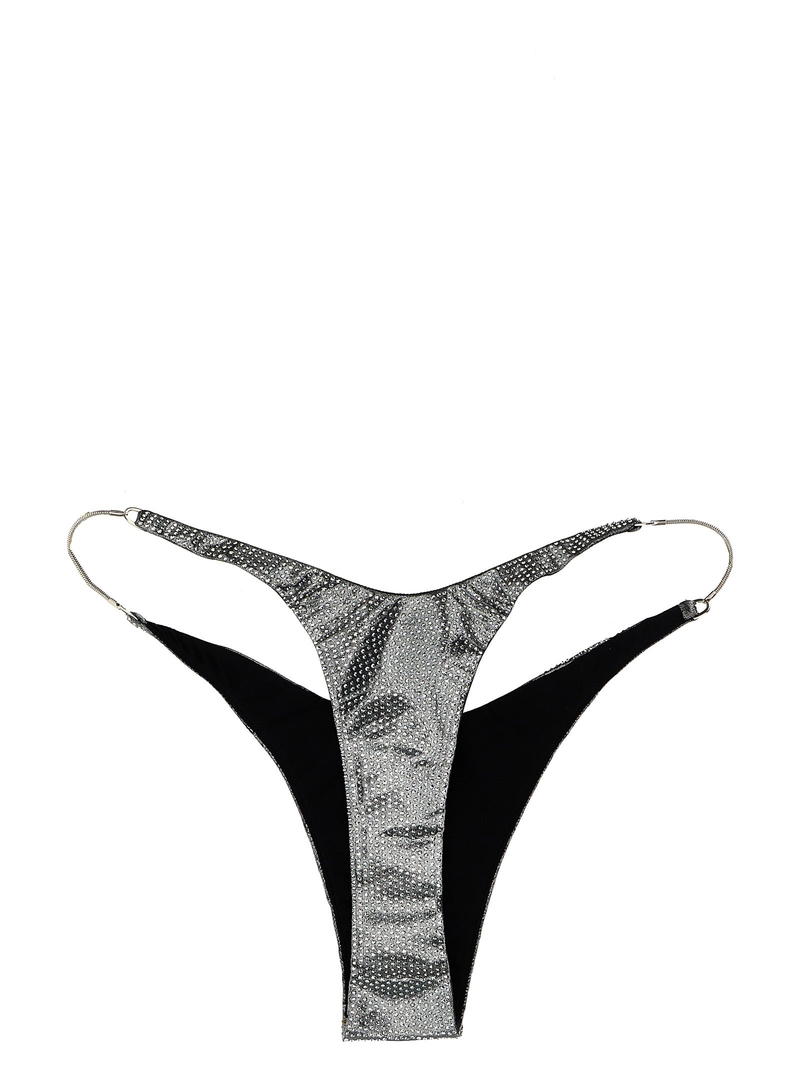 Bikini bottoms in metallic fabric with all-over rhinestones, metal chain sides.