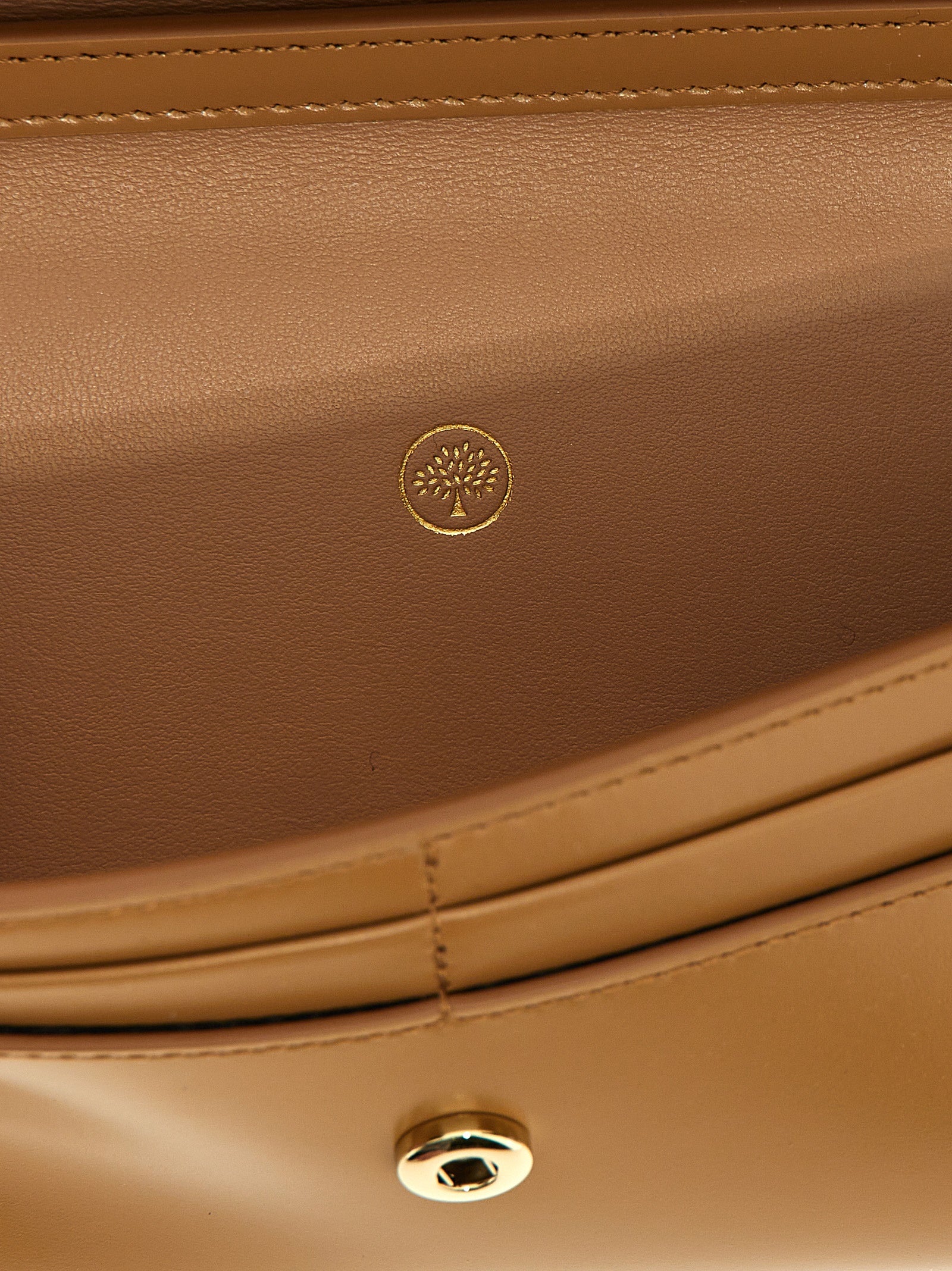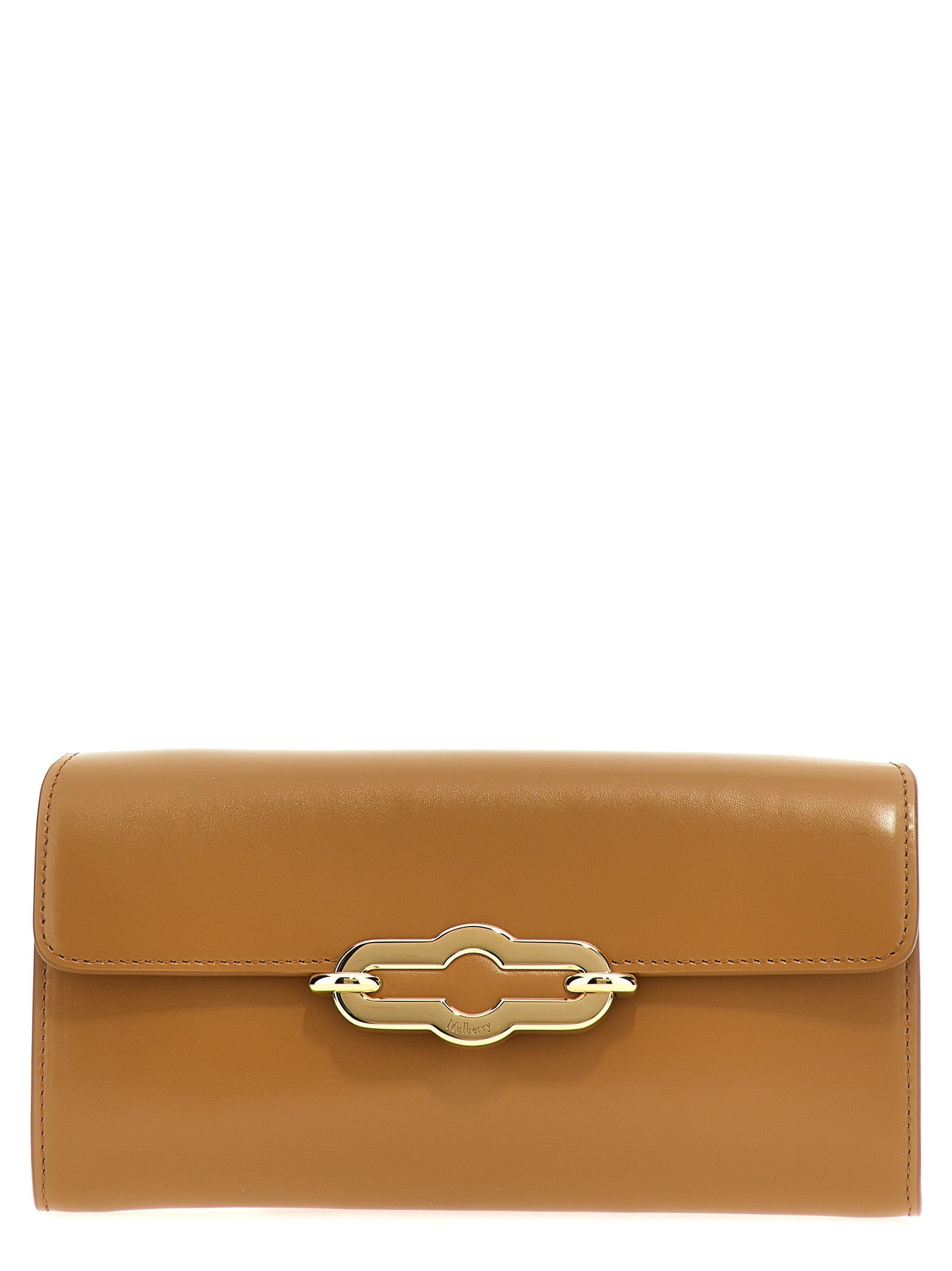 Leather wallet on chain, snap flap closure with front metal 'Pimlico' padlock decoration, adjustable and removable shoulder strap.