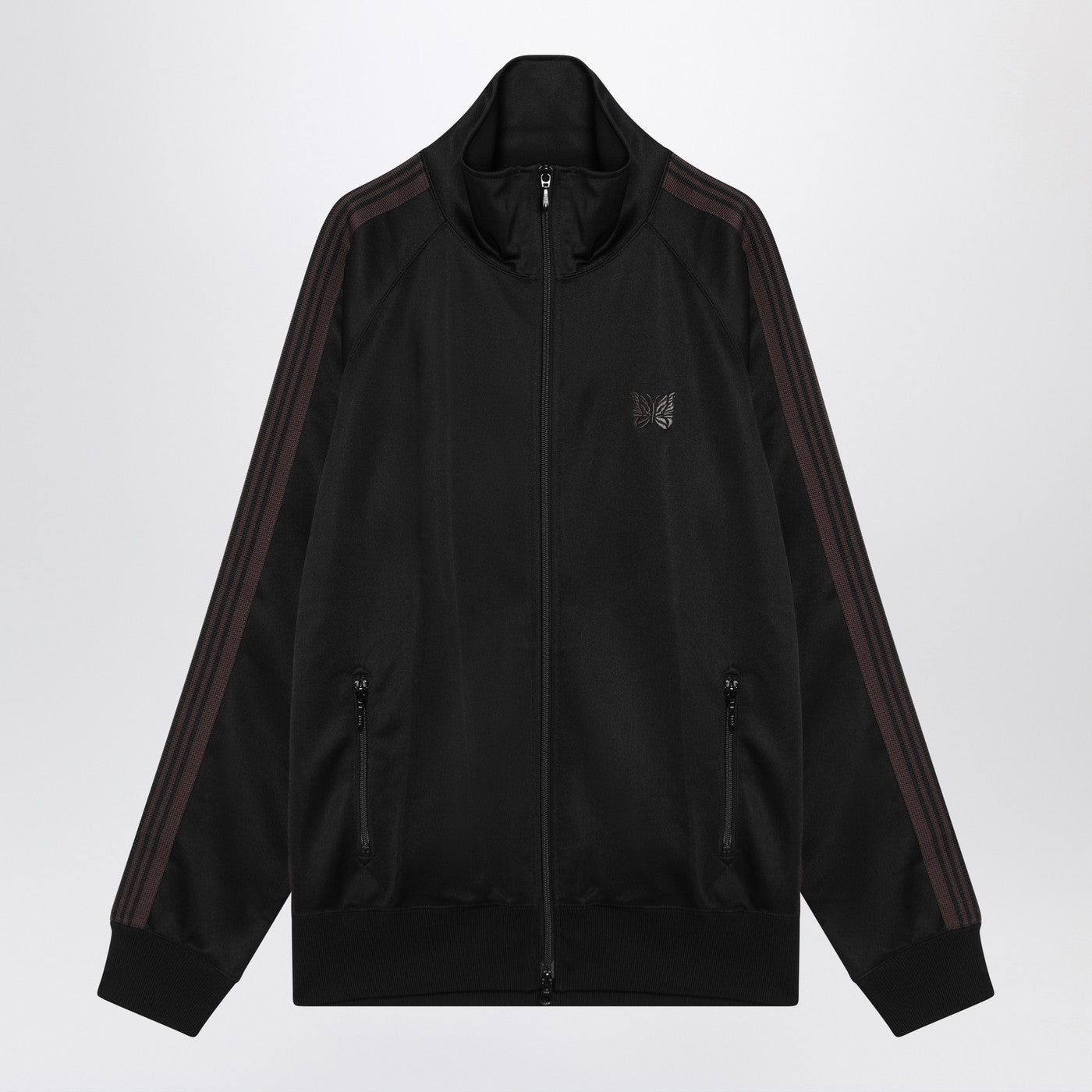 Black Needles sweatshirt featuring a high collar, long sleeves with striped band, a double zip front fastening, two zip pockets on the front, an embroidered logo on the chest and ribbed edges.