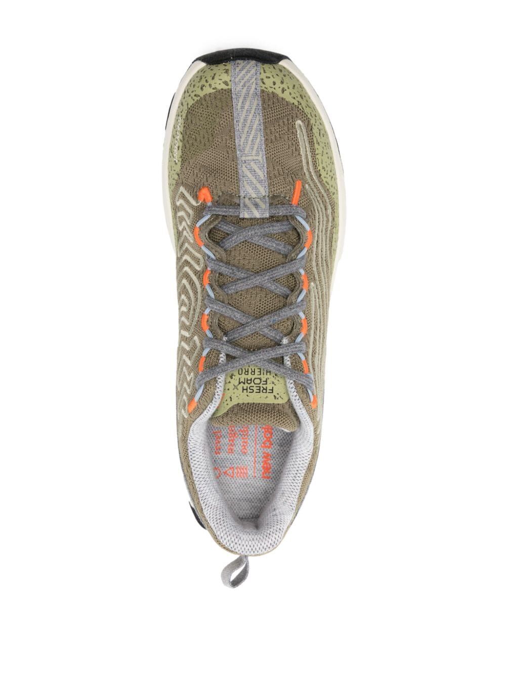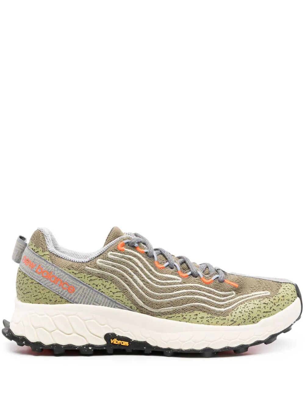 Fresh Foam X Hierro V7 sneakers from NEW BALANCE featuring mesh design, round toe, front lace-up fastening, logo patch at the tongue, pull-tab at the heel, branded insole, Vibram® sole, chunky rubber sole and khaki/grey/orange.