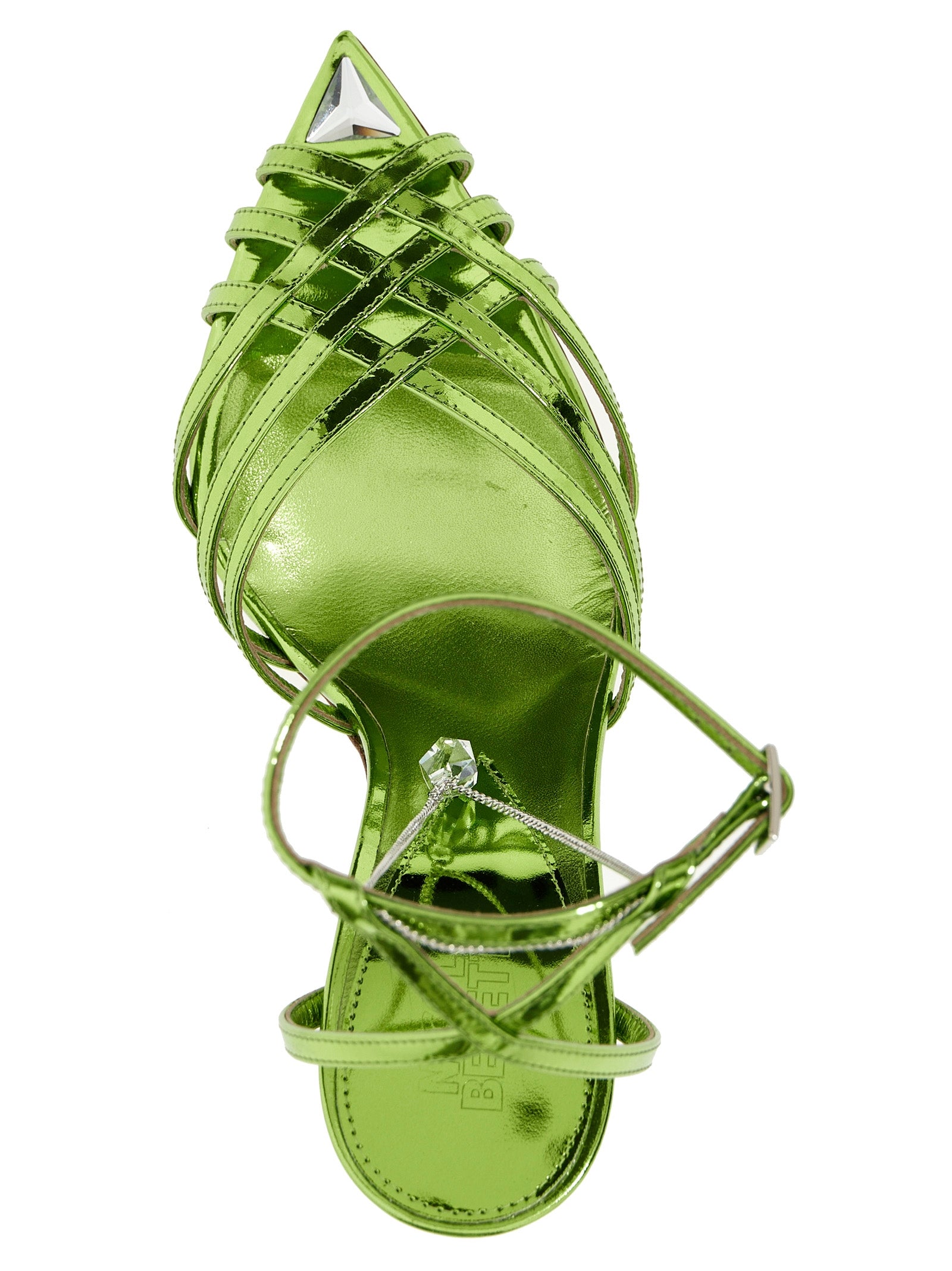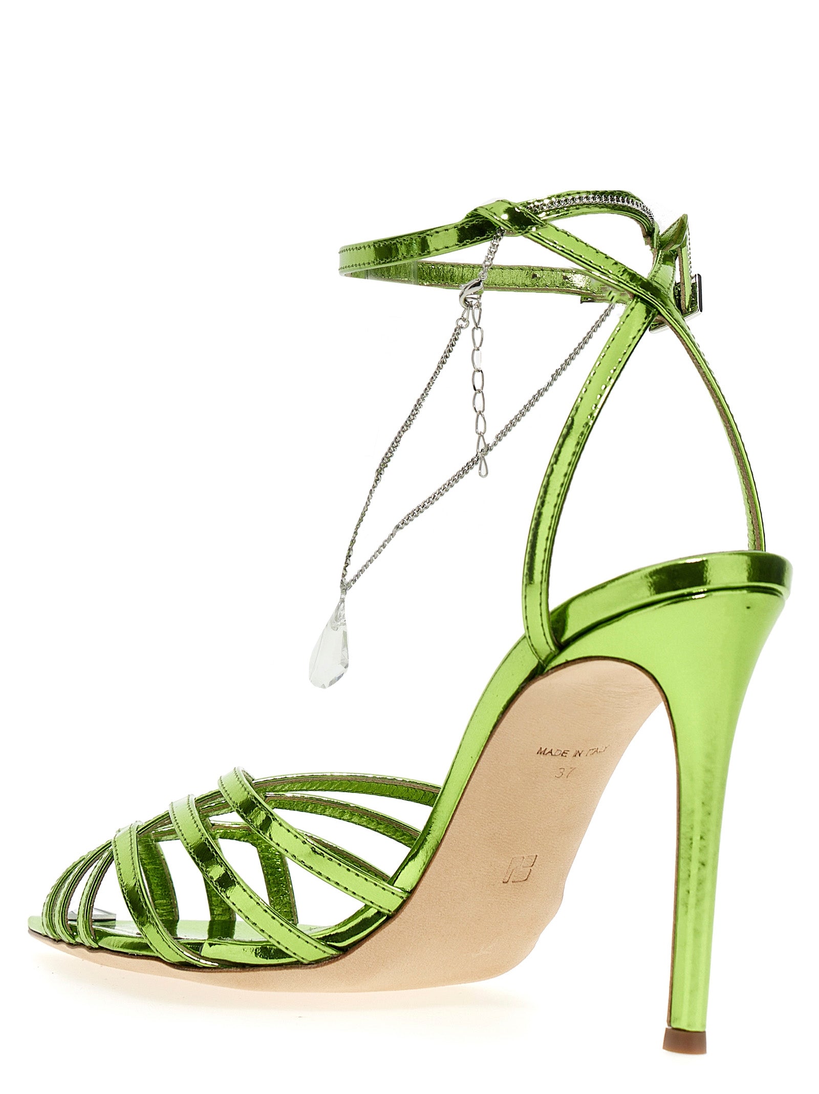 Levy' laminated leather sandals with pointed toe with crystal appliqué, front thin straps, ankle strap with metal chain detail and a crystal pendant.