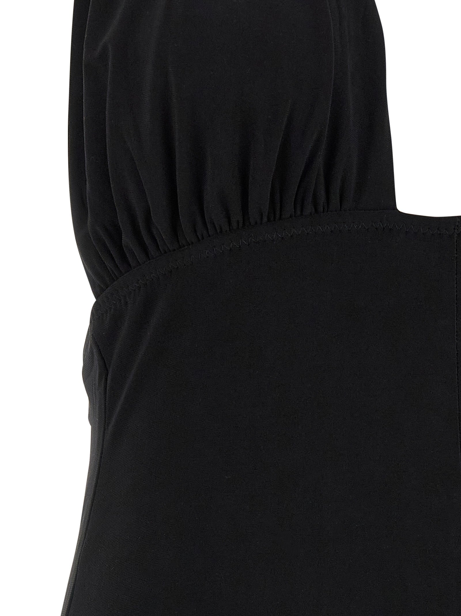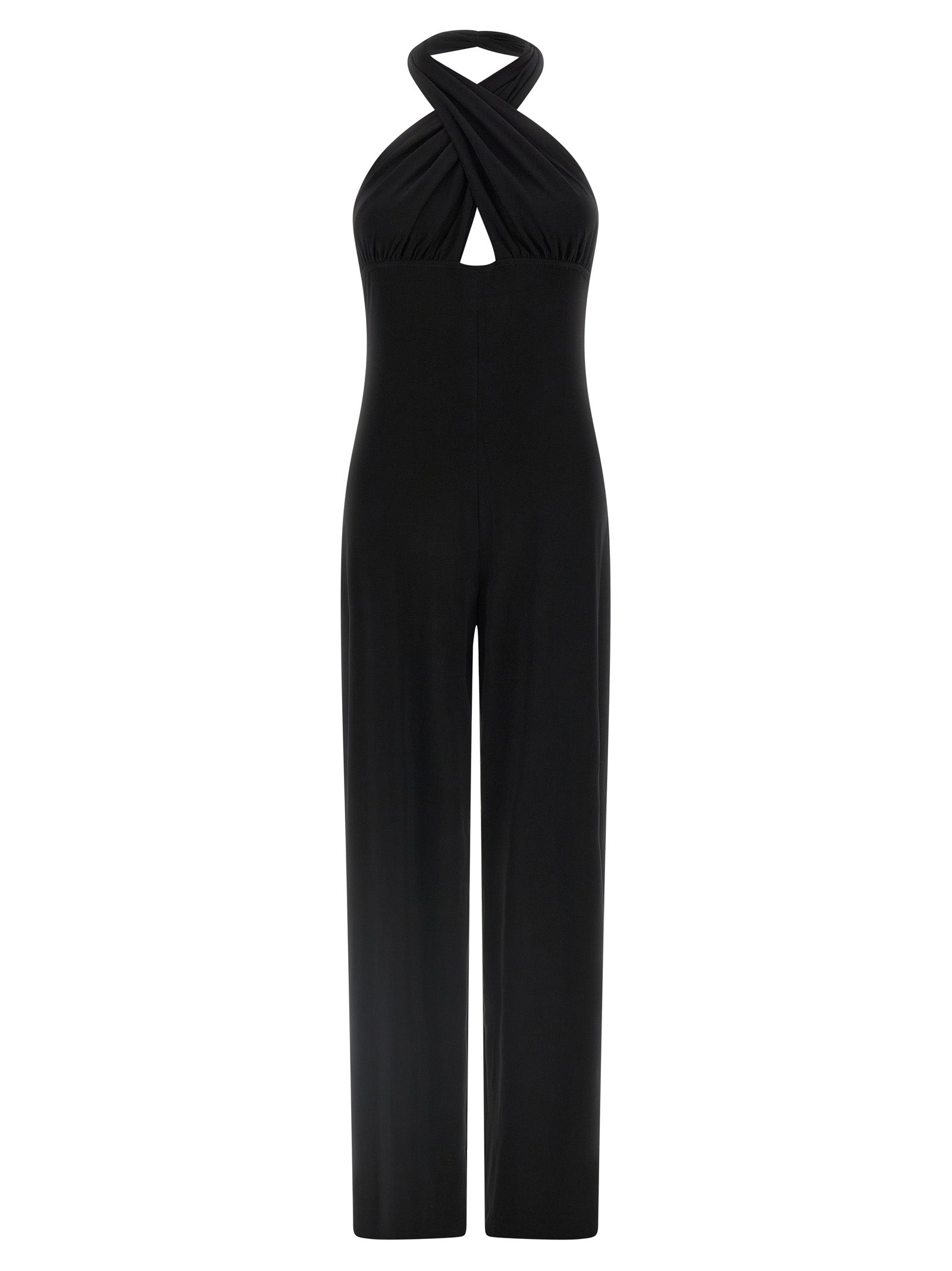 'Cross Halter Straight Leg' 4-way stretch poly lycra jumpsuit with crossed front with cut-out detail, sleeveless, bare back, straight leg.